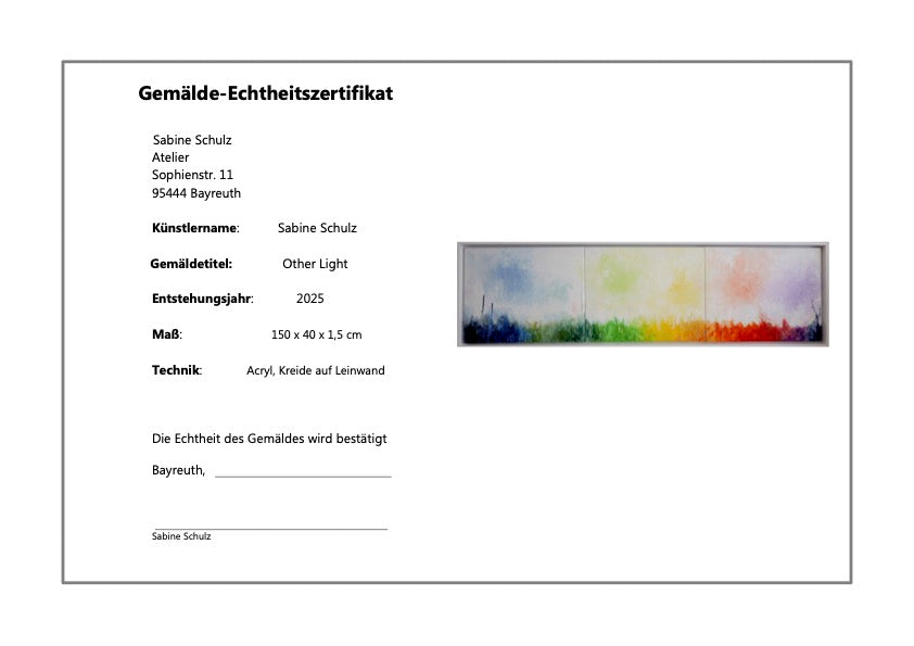 Die Spuren von Kreide durchbrechen die fließenden Übergänge der Acrylfarben mit einer feinen Geste. Sie wirken wie Erinnerungen, flüchtig, aber gesetzt. Wie ein leiser Widerstand gegen das reine Auflösen. Und vielleicht ist es genau dieser Widerstand, der dem Werk seine Tiefe verleiht. Other Light stellt keine Fragen, es gibt keine Antworten – aber es öffnet Räume, in denen beides möglich ist.