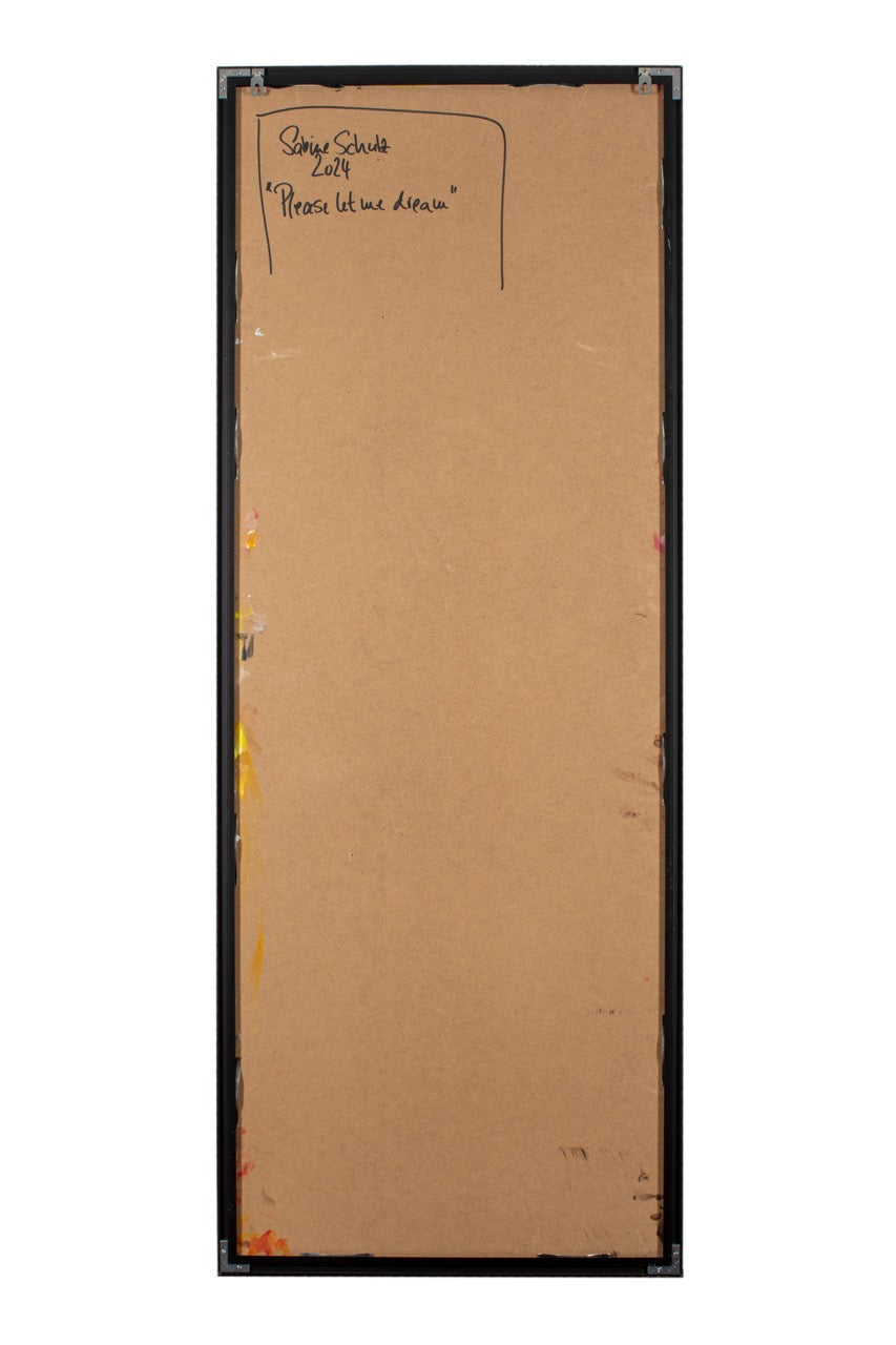 Das Format selbst verstärkt die Wirkung: Die Vertikale suggeriert Aufrichtung, Bewegung nach oben, eine Art Durchbruch – möglicherweise aus einem inneren Dunkel ins Licht. Das Bild strahlt dabei eine unverkennbare Dringlichkeit aus, ein Bedürfnis nach Ausdruck, aber auch nach Schutz: Please let me Dream – der Titel ist eine fast flehende Bitte, Träumen Raum zu geben.