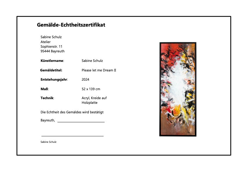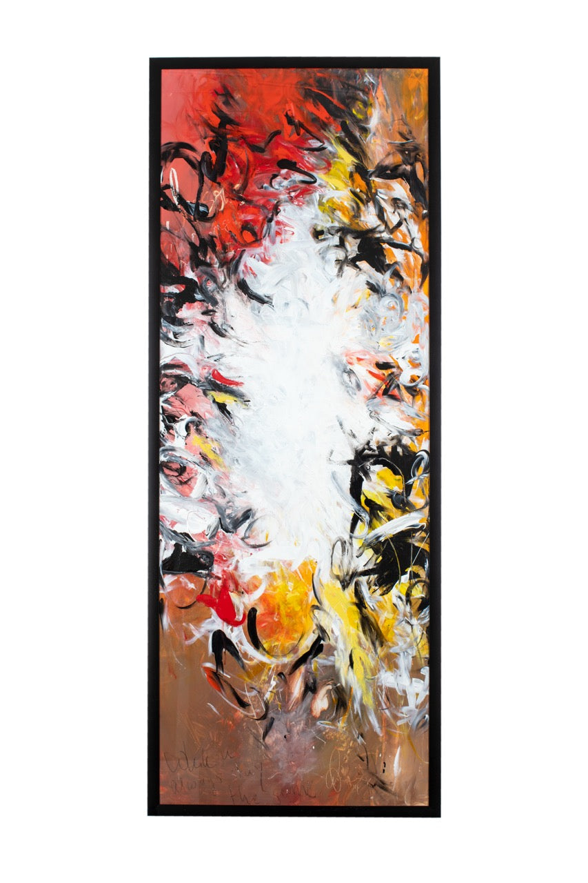 In Please let me Dream II begegnen wir einer eruptiven Farbdynamik, die sich in einem vertikalen Format eindrucksvoll entfaltet. Das Werk ist ein leidenschaftlicher Ausbruch von Bewegung, Farbe und Emotion – mit einem Zentrum aus strahlendem Weiß, das wie ein Lichtkern wirkt, umgeben von kraftvollen Farbzonen in Rot, Schwarz, Gelb und Orange.