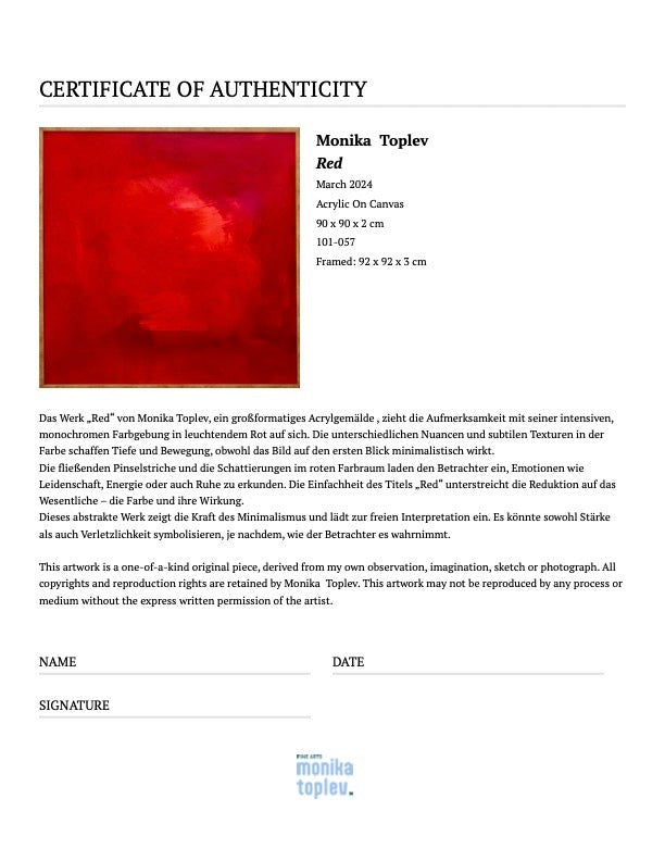 Das Werk „Red“ von Monika Toplev, ein großformatiges Acrylgemälde, zieht die Aufmerksamkeit mit seiner intensiven, monochromen Farbgebung in leuchtendem Rot auf sich. Die unterschiedlichen Nuancen und subtilen Texturen in der Farbe schaffen Tiefe und Bewegung, obwohl das Bild auf den ersten Blick minimalistisch wirkt.