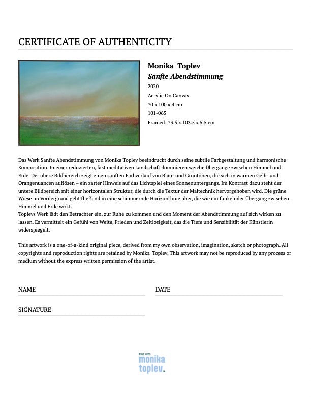 Das Werk Sanfte Abendstimmung von Monika Toplev beeindruckt durch seine subtile Farbgestaltung und harmonische Komposition. In einer reduzierten, fast meditativen Landschaft dominieren weiche Übergänge zwischen Himmel und Erde. Der obere Bildbereich zeigt einen sanften Farbverlauf von Blau- und Grüntönen, die sich in warmen Gelb- und Orangenuancen auflösen – ein zarter Hinweis auf das Lichtspiel eines Sonnenuntergangs.