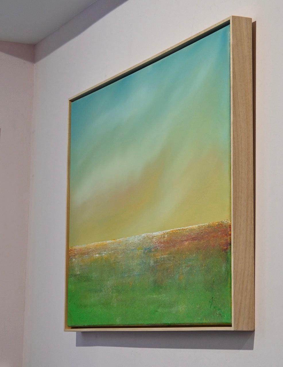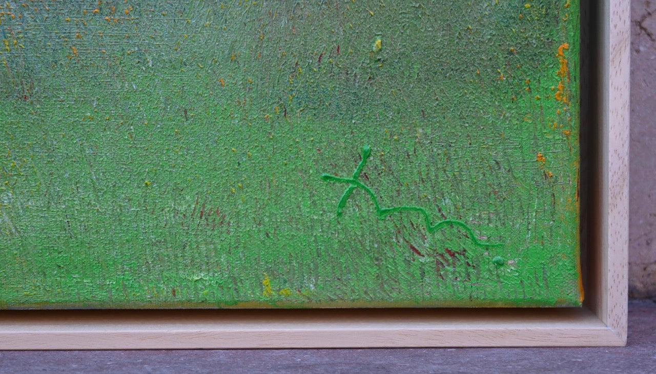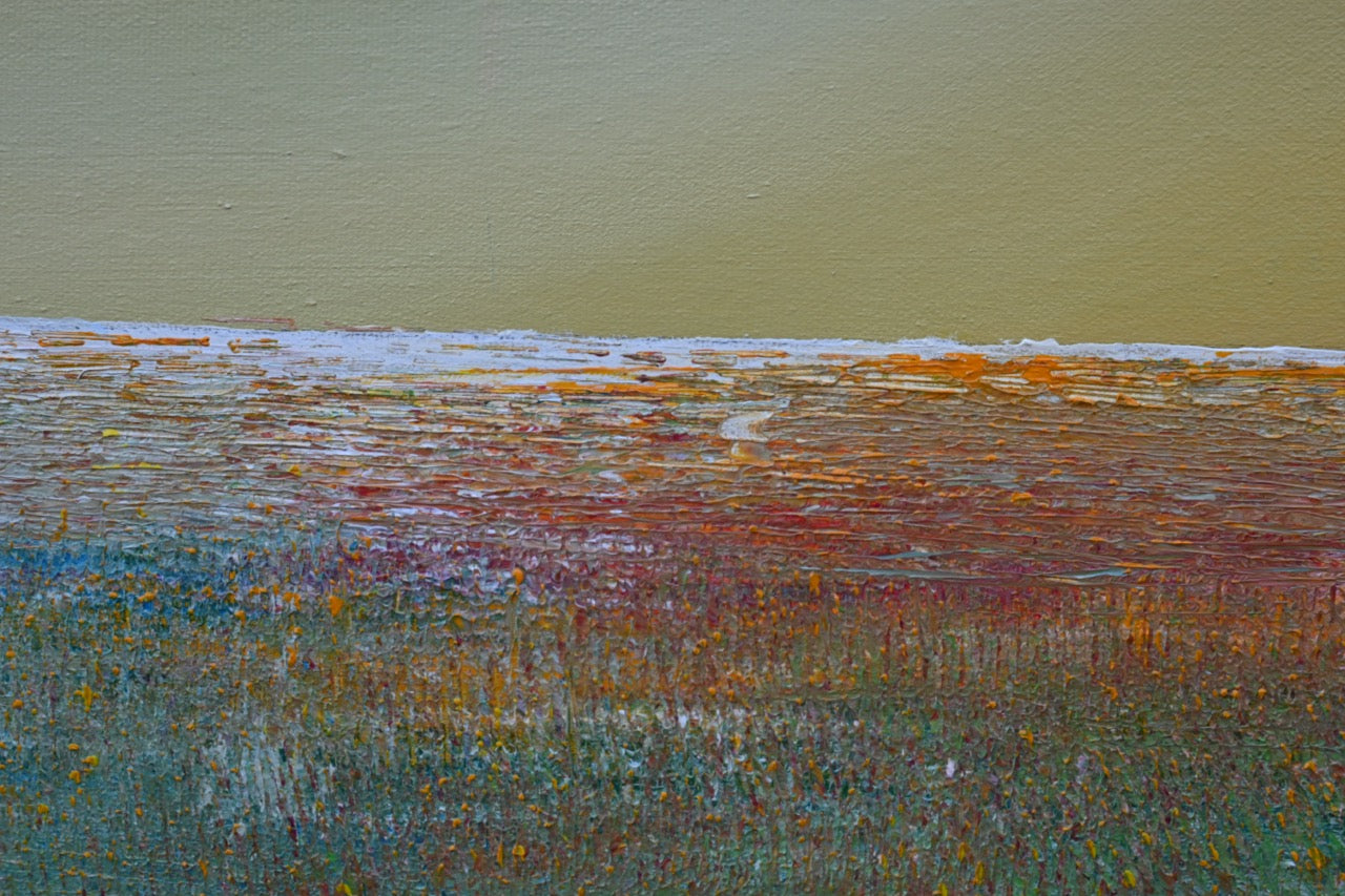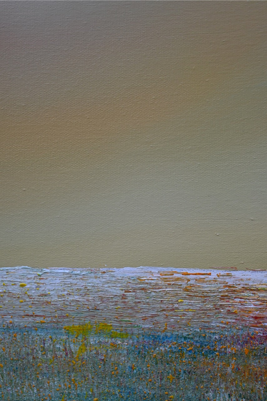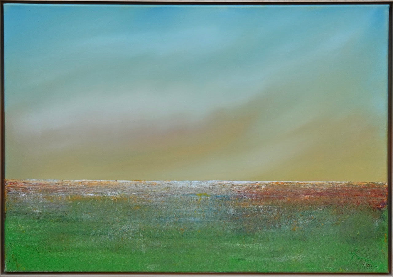 Im Kontrast dazu steht der untere Bildbereich mit einer horizontalen Struktur, die durch die Textur der Maltechnik hervorgehoben wird. Die grüne Wiese im Vordergrund geht fließend in eine schimmernde Horizontlinie über, die wie ein funkelnder Übergang zwischen Himmel und Erde wirkt.