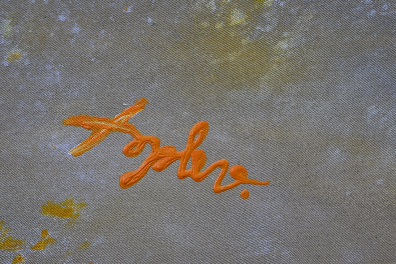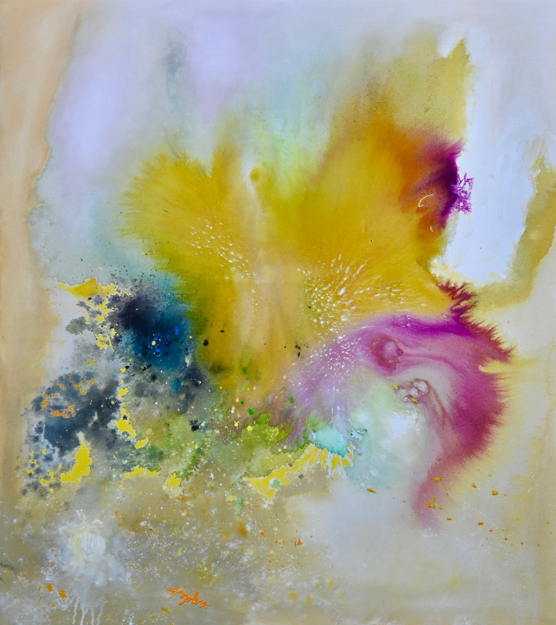 Das Bild ist eine abstrakte Komposition, die hauptsächlich aus Farbverläufen und -spritzern besteht. Die dominierenden Farben sind Gelb, Gold, Rosa und Lila, die ineinander übergehen und ein dynamisches Zusammenspiel erzeugen. Im Zentrum des Bildes findet sich ein intensiv gelber Bereich, der wie eine Explosion oder ein leuchtender Stern aussieht, von dem aus sich Farbfäden und -flecken in alle Richtungen ausbreiten. Diese erinnern an Flammen oder kosmische Partikel. Im unteren linken Bereich des Bildes sind dunklere Farbtöne, darunter Blau und Grau, zu sehen, die einen Kontrast zu den hellen Farben schaffen. Es gibt auch kleine goldene und weiße Punkte, die über die gesamte Fläche gestreut sind und dem Bild einen glitzernden, funkelnden Eindruck verleihen. Die Textur des Bildes scheint weich und luftig zu sein, mit Unschärfe-Effekten, die die Bewegung und Energie der Farben betonen. Die Gesamtstimmung des Bildes ist aufregend, dynamisch und voller Energie, aber gleichzeitig auch ruhig und meditativ durch die weichen Farbübergänge. Das Bild wirkt wie eine Darstellung von Schöpfung oder Transformation, die mit Wärme und Hoffnung einhergeht.