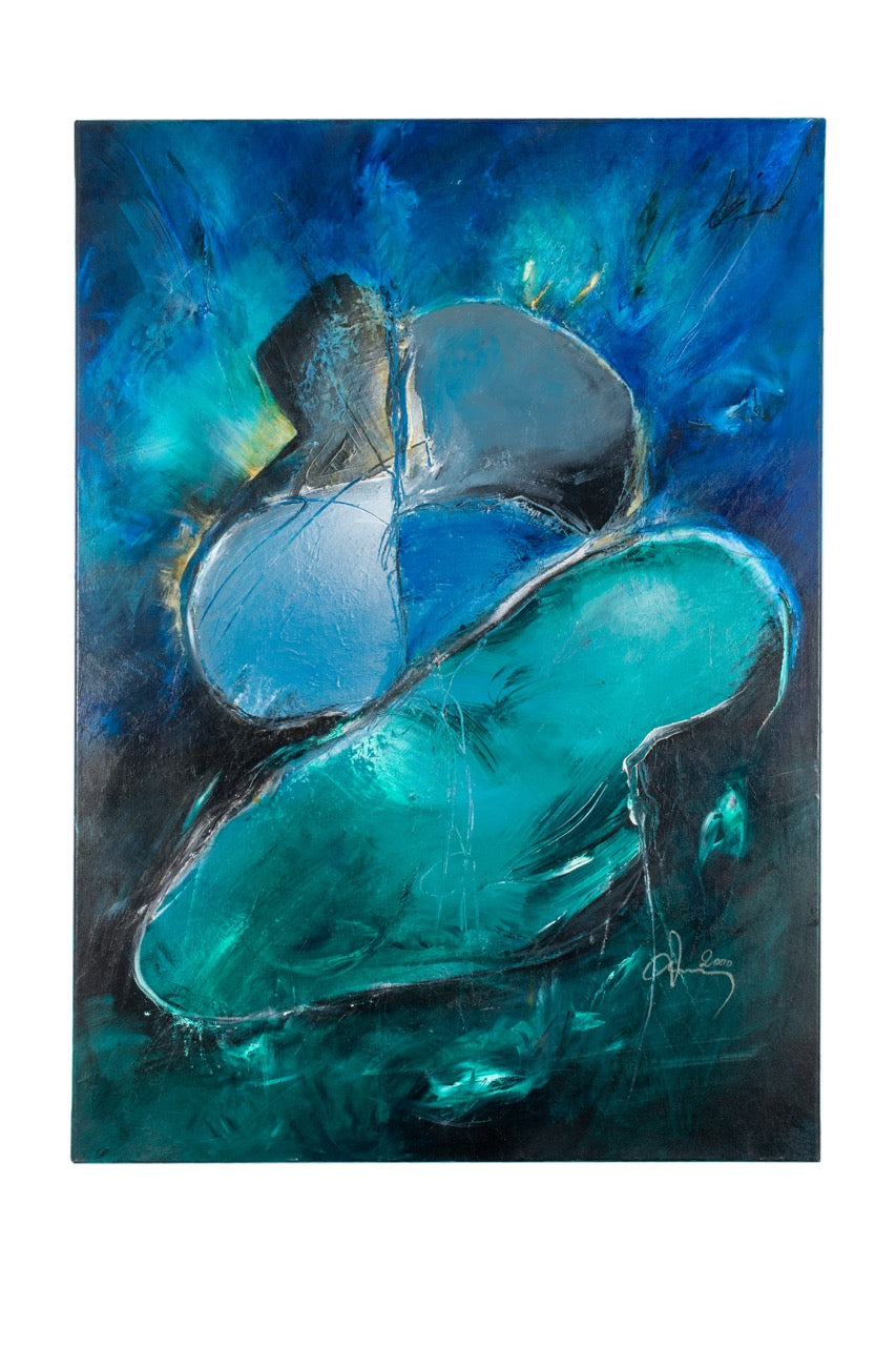 Im Zentrum stehen zwei große, amorphe, fast körperhafte Formen in leuchtendem Türkis, Blau und Grau – eingebettet in ein dynamisches Umfeld aus dunklen Blau- und Schwarznuancen, durchzogen von Lichtreflexen und schimmernden Lasuren.