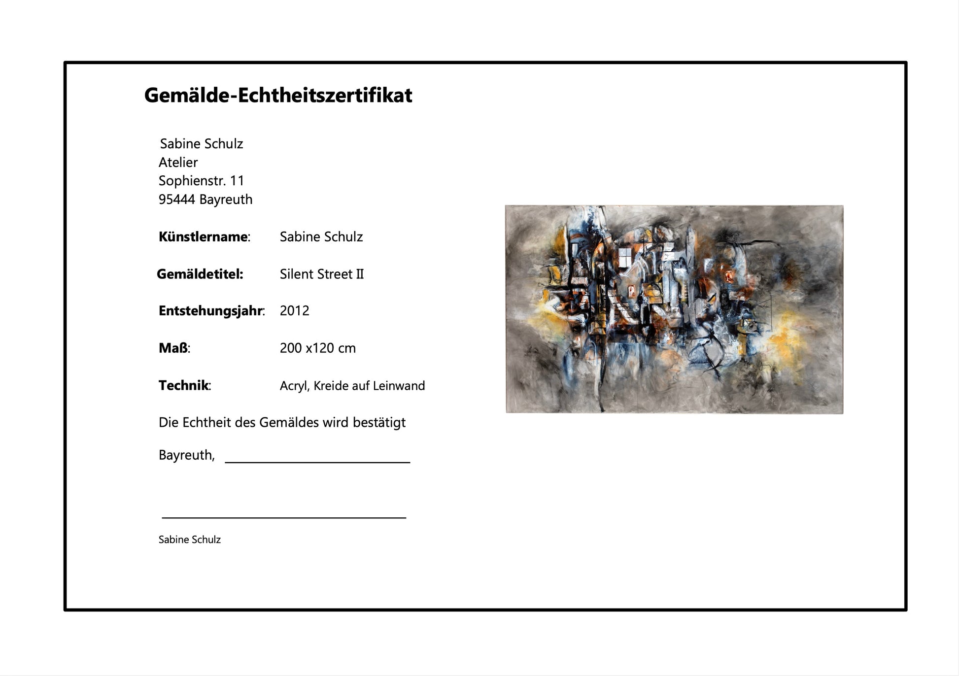 Die Linien und Flächen wirken wie grafische Erinnerungen – kartografische Spuren eines Ortes, der nicht mehr klar benennbar ist. Nichts ist eindeutig, alles ist im Fluss. Rauchige Übergänge, kratzige Markierungen und malerische Verdichtungen erzeugen eine Atmosphäre, die zwischen Gegenwart und Vergangenheit oszilliert. „Silent Street II“ ist keine konkrete Straßenszene, sondern ein emotional verdichtetes Echo urbaner Erfahrung – eine Momentaufnahme von Auflösung, Verwandlung und Verlorenheit im Stadtraum. In dieser Stille liegt keine Leere, sondern ein konzentriertes Rauschen, das vom Leben zwischen den Linien erzählt.