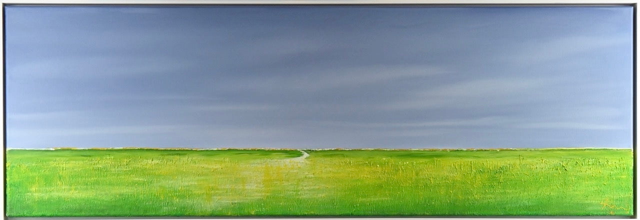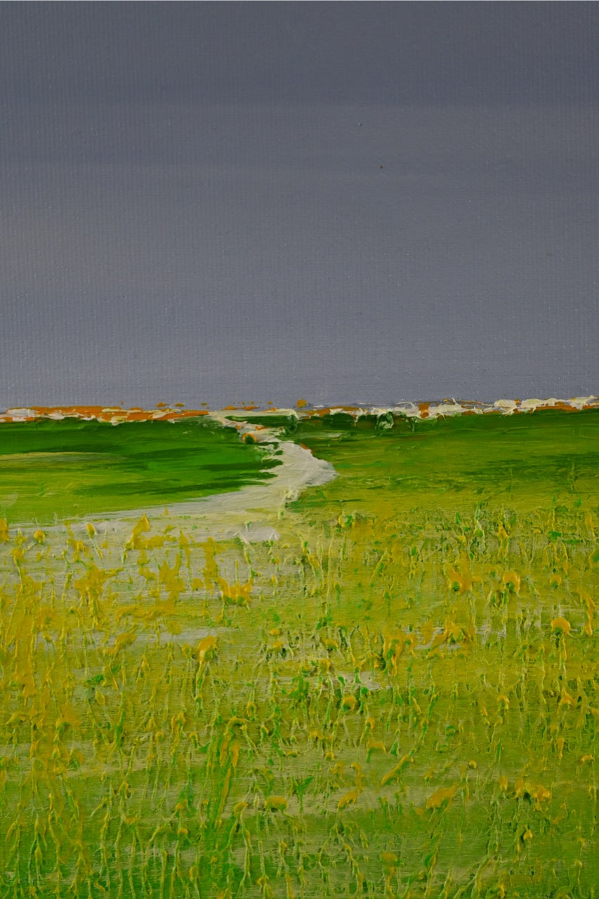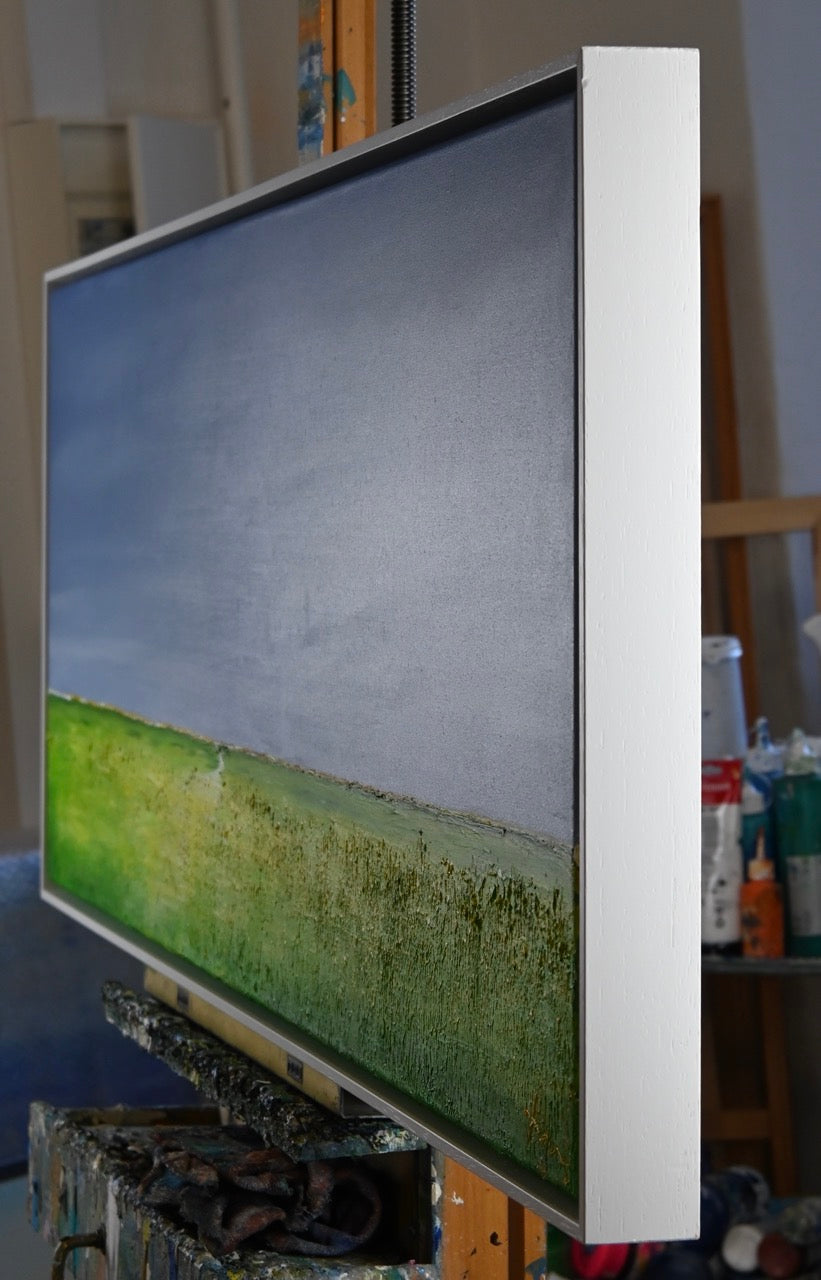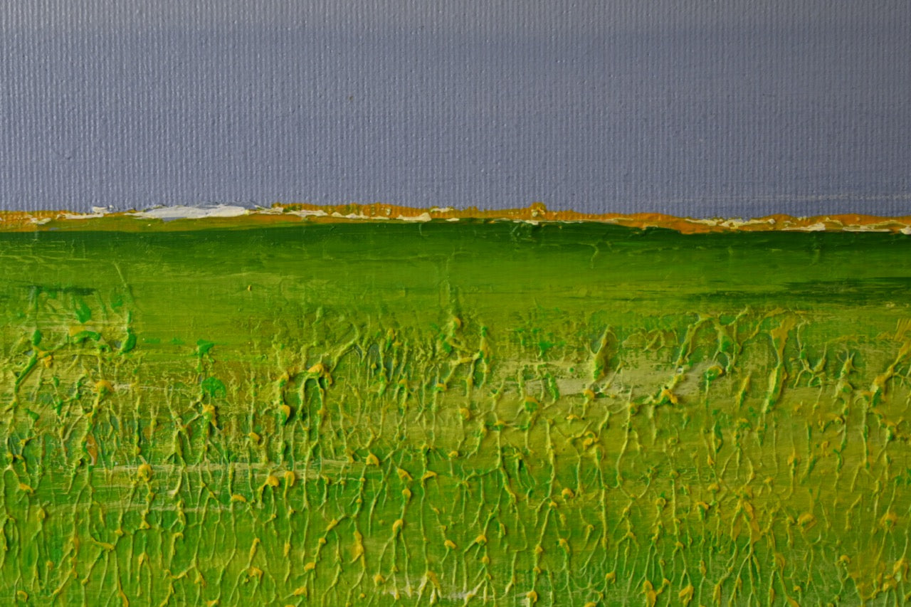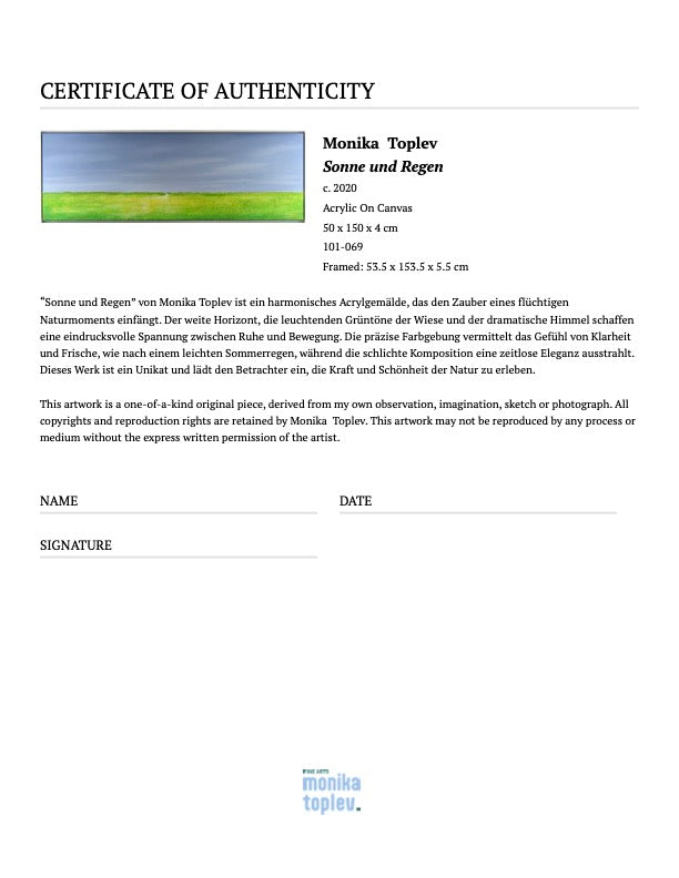 “Sonne und Regen” von Monika Toplev besticht durch seine meisterhafte Balance zwischen Licht und Farbe. In einer scheinbar schlichten Landschaft entfaltet sich eine subtile Dynamik: Der kräftige Kontrast zwischen der satten, grün schimmernden Wiese und dem weichen, von Licht durchdrungenen Himmel spiegelt die Flüchtigkeit eines Wetterwechsels wider. Toplev arbeitet mit einer klaren Farbstruktur und schafft eine Komposition, die sowohl Ruhe als auch Bewegung verkörpert. Dieses Werk lädt den Betrachter ein, den Moment der Naturverbundenheit intensiv nachzuempfinden und verweist auf die zeitlose Kraft des Minimalismus in der Landschaftsmalerei.