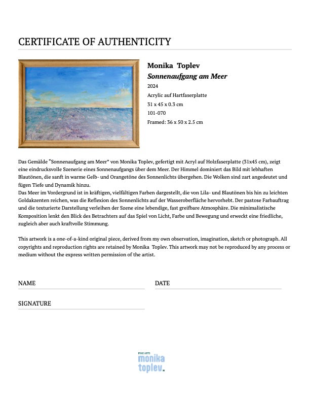 Das Gemälde “Sonnenaufgang am Meer” von Monika Toplev, gefertigt mit Acryl auf Holzfaserplatte (31x45 cm), zeigt eine eindrucksvolle Szenerie eines Sonnenaufgangs über dem Meer. Der Himmel dominiert das Bild mit lebhaften Blautönen, die sanft in warme Gelb- und Orangetöne des Sonnenlichts übergehen. Die Wolken sind zart angedeutet und fügen Tiefe und Dynamik hinzu.