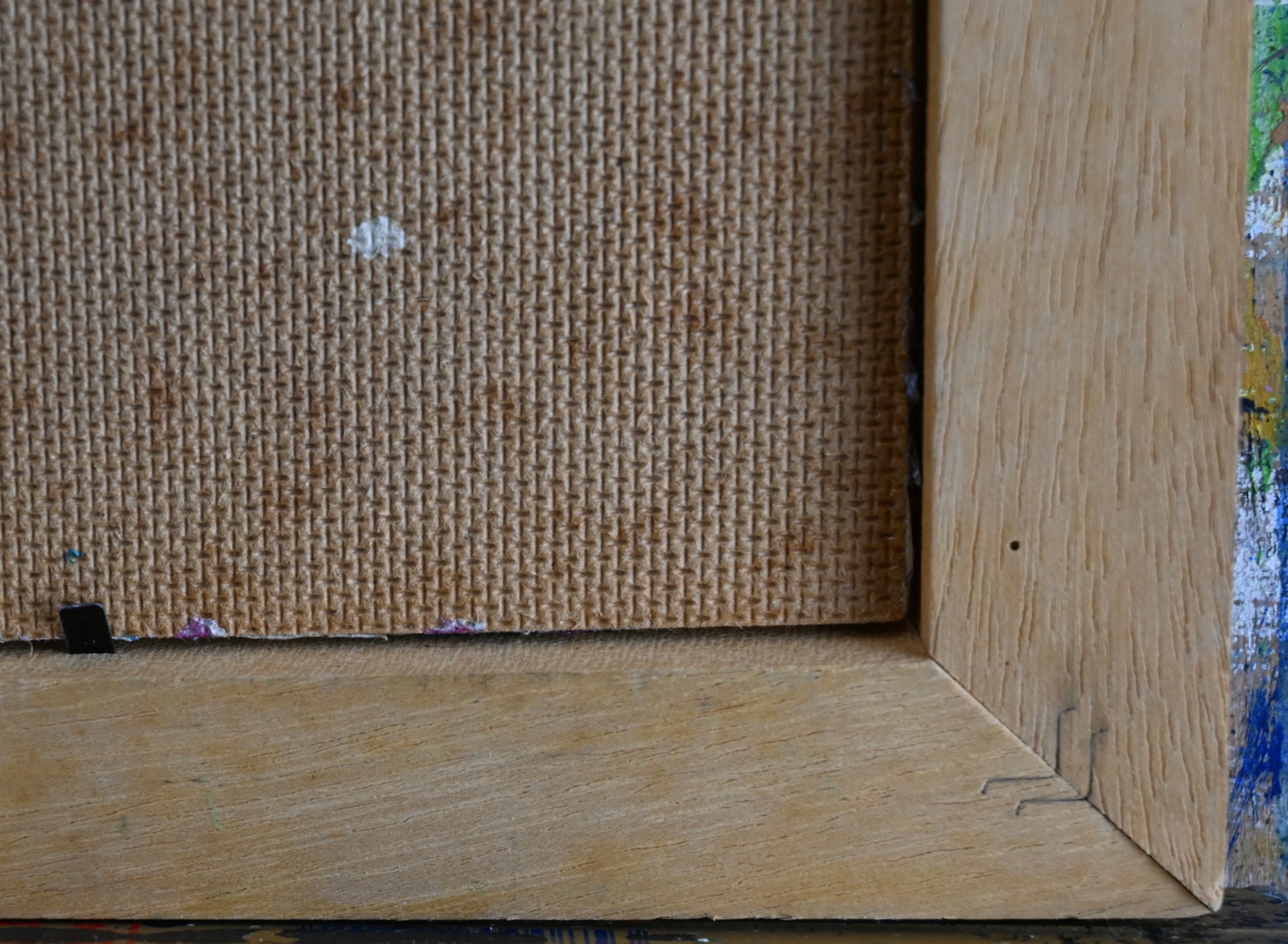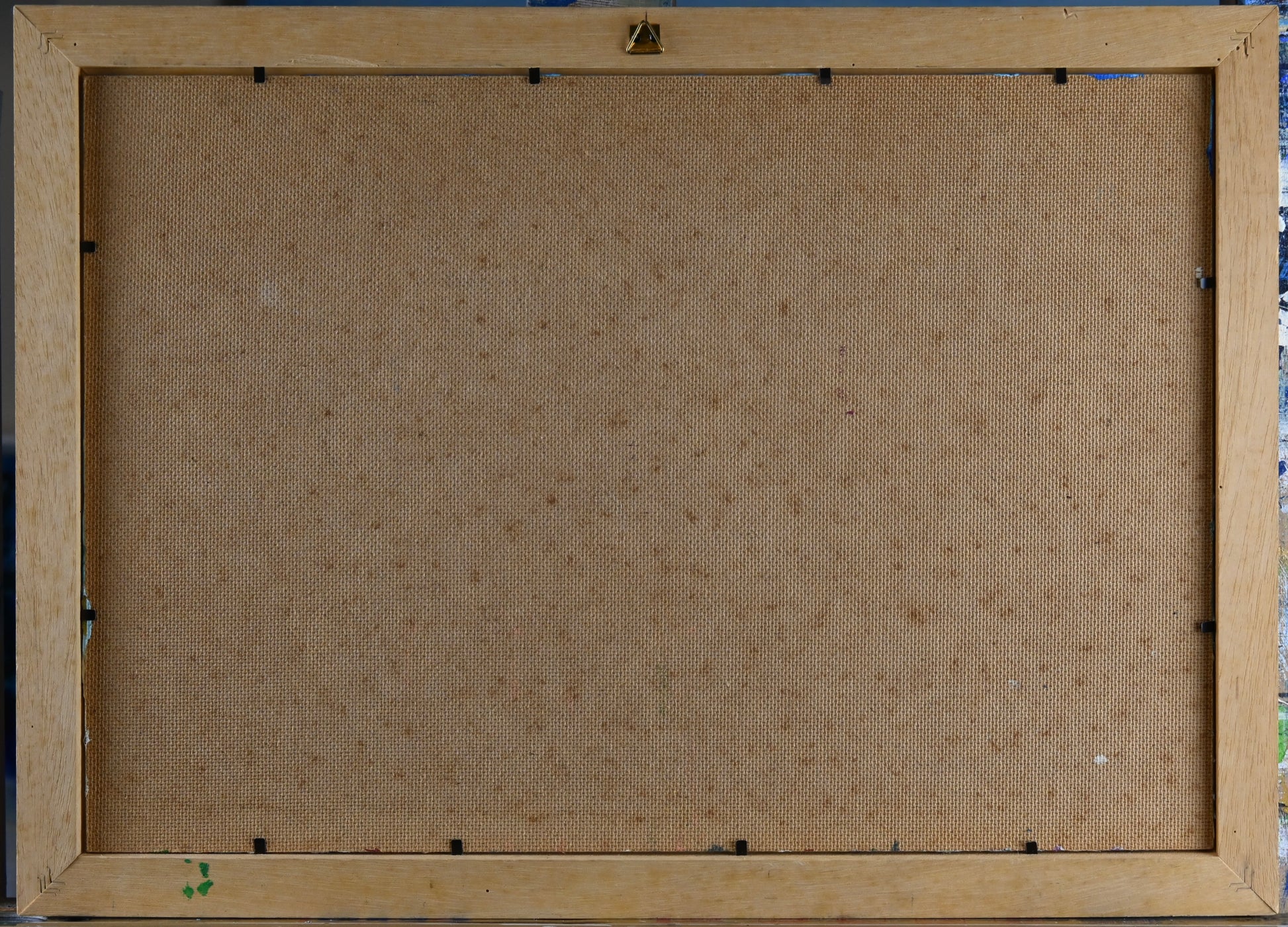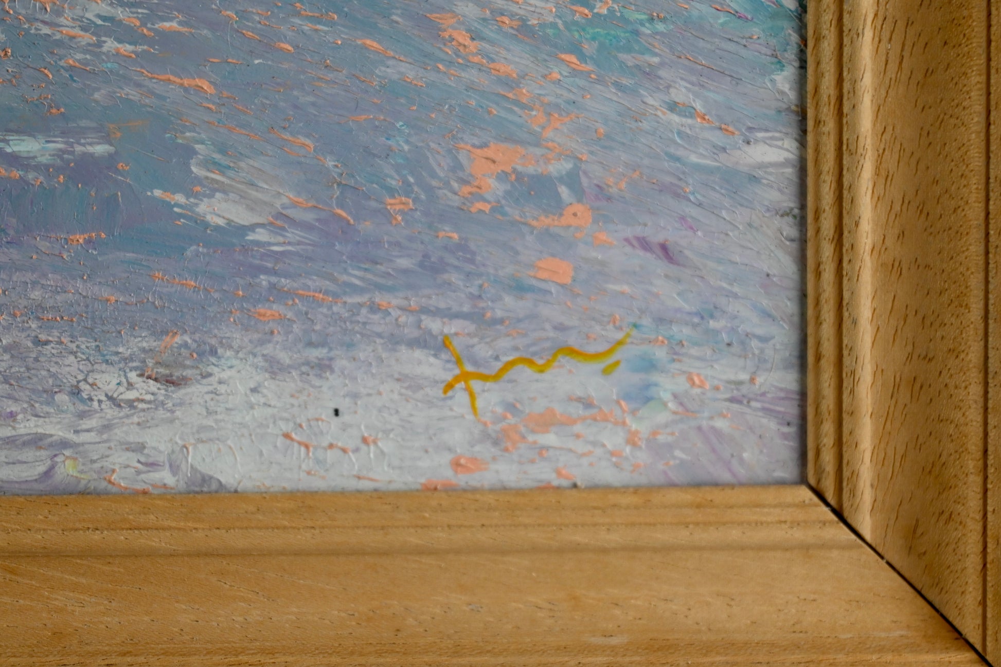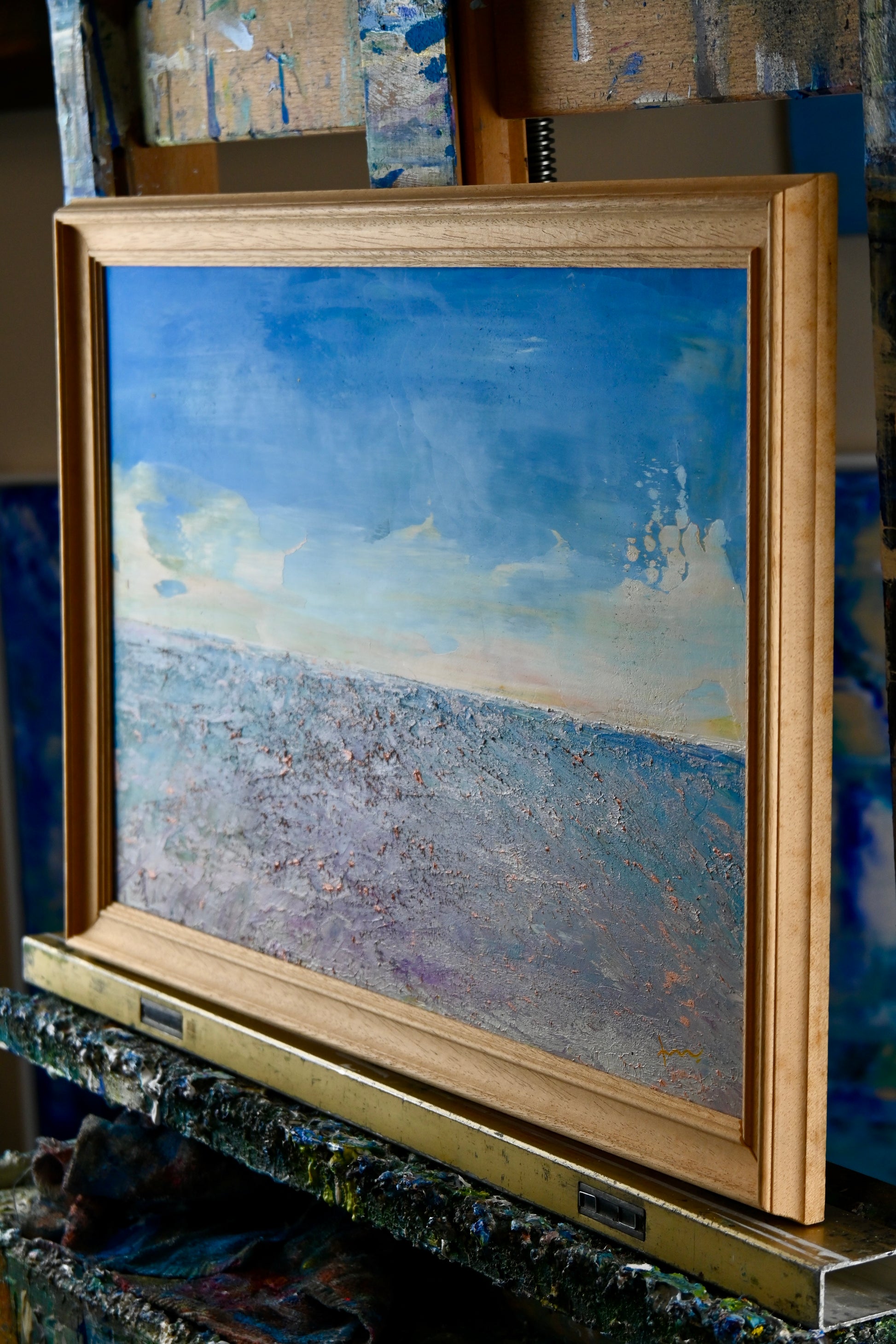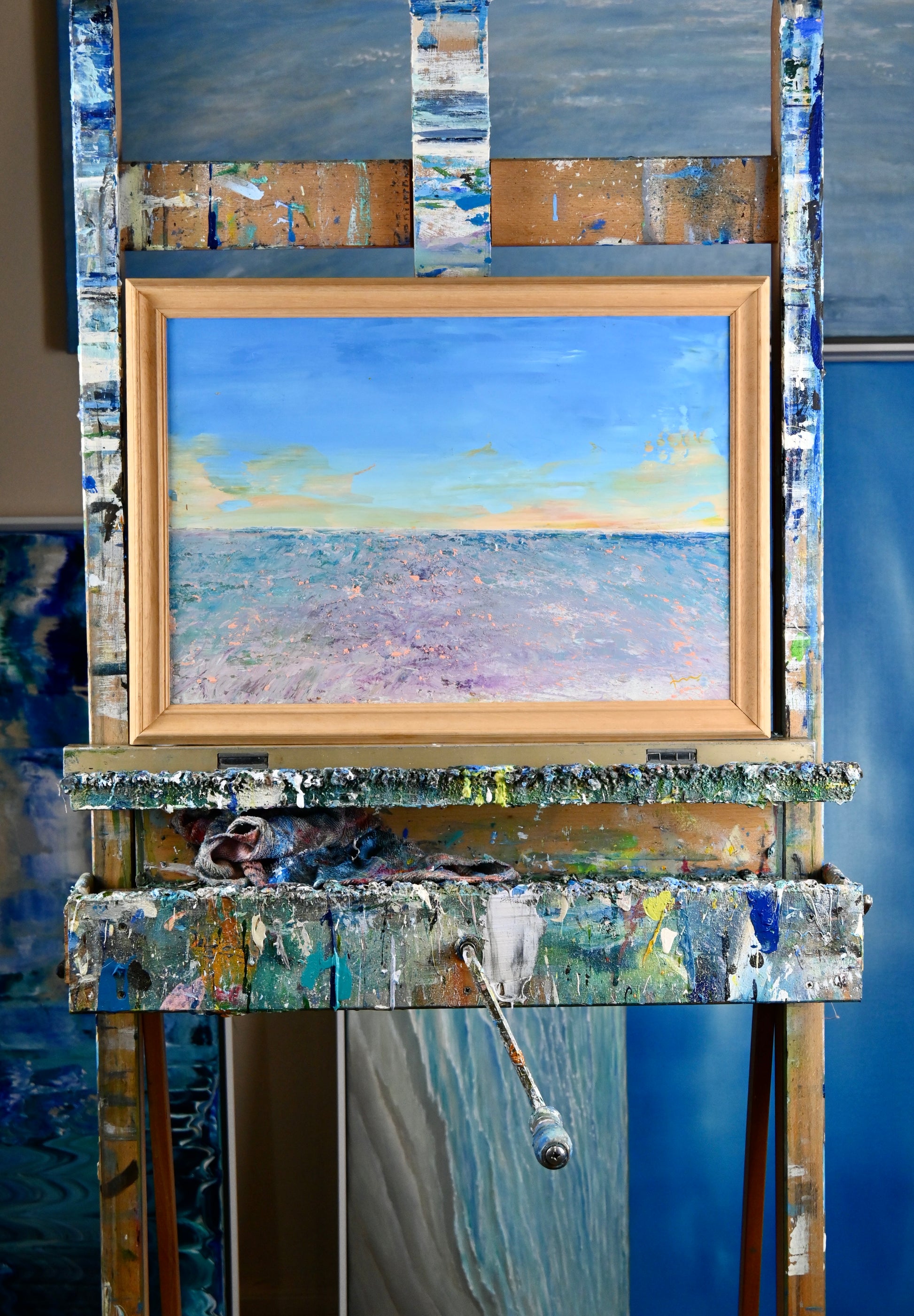 Das Meer im Vordergrund ist in kräftigen, vielfältigen Farben dargestellt, die von Lila- und Blautönen bis hin zu leichten Goldakzenten reichen, was die Reflexion des Sonnenlichts auf der Wasseroberfläche hervorhebt. Der pastose Farbauftrag und die texturierte Darstellung verleihen der Szene eine lebendige, fast greifbare Atmosphäre. Die minimalistische Komposition lenkt den Blick des Betrachters auf das Spiel von Licht, Farbe und Bewegung und erweckt eine friedliche, zugleich aber auch kraftvolle Stimmung.