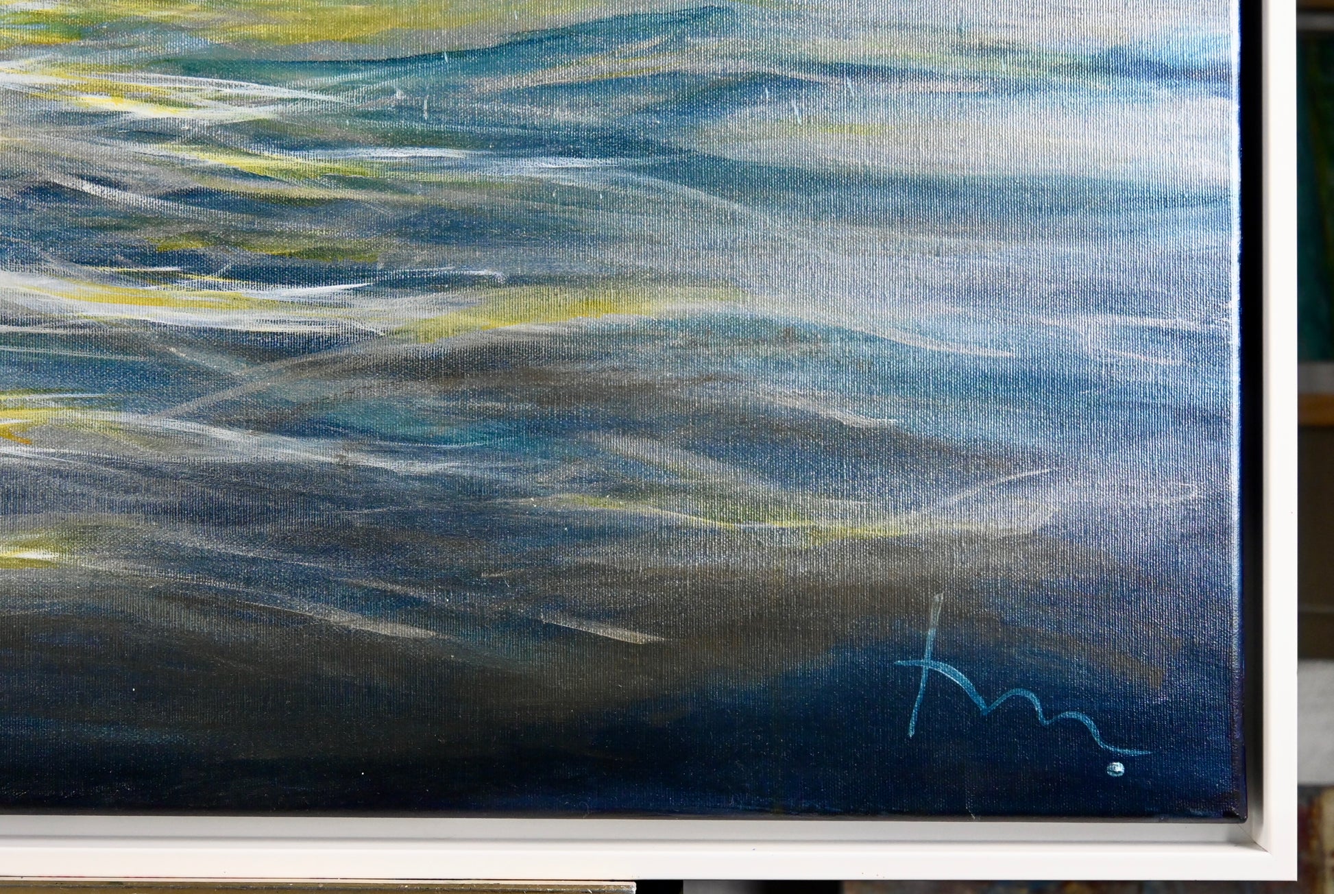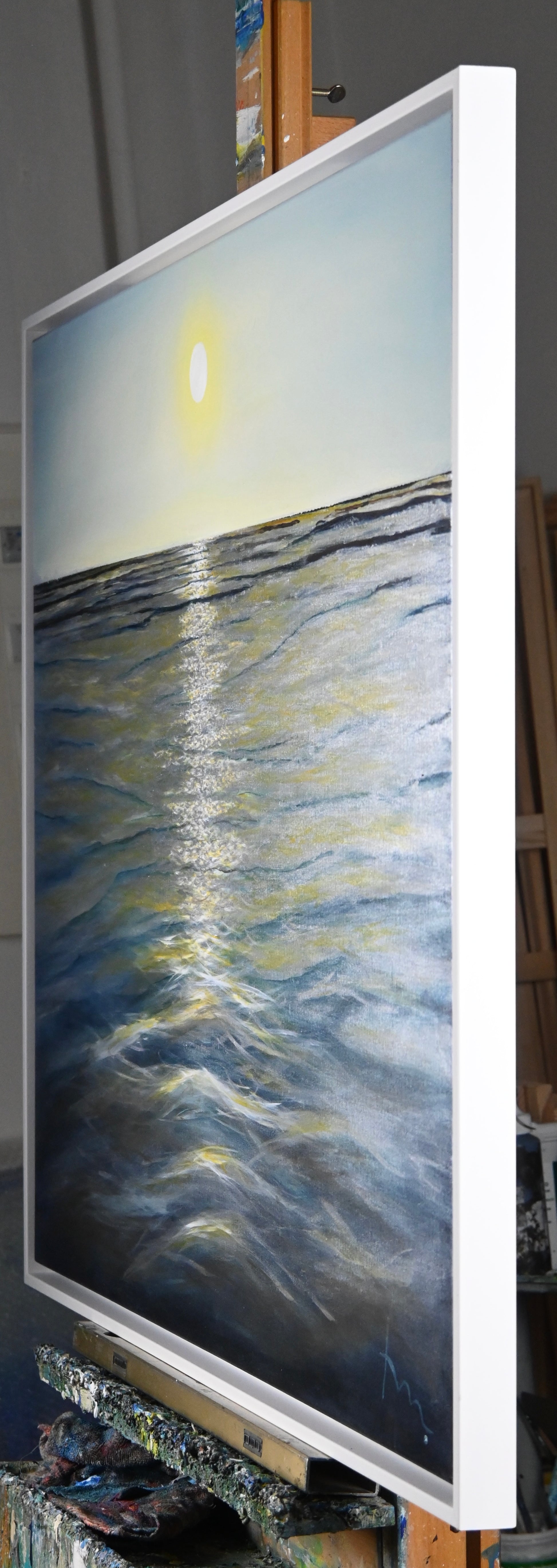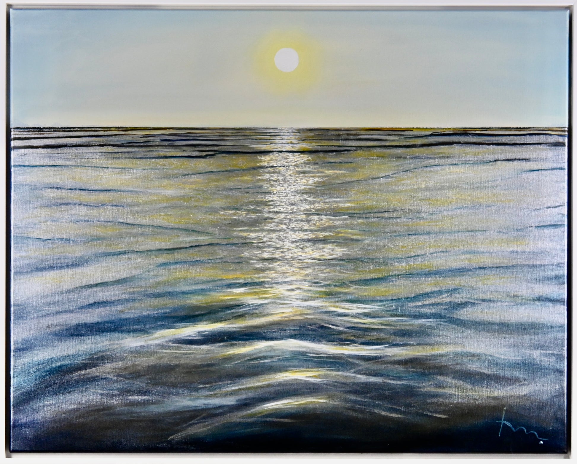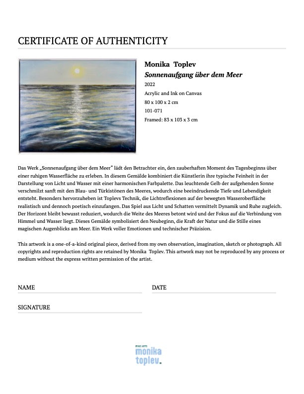 Besonders hervorzuheben ist Toplevs Technik, die Lichtreflexionen auf der bewegten Wasseroberfläche realistisch und dennoch poetisch einzufangen. Das Spiel aus Licht und Schatten vermittelt Dynamik und Ruhe zugleich. Der Horizont bleibt bewusst reduziert, wodurch die Weite des Meeres betont wird und der Fokus auf die Verbindung von Himmel und Wasser liegt. Dieses Gemälde symbolisiert den Neubeginn, die Kraft der Natur und die Stille eines magischen Augenblicks am Meer. Ein Werk voller Emotionen und technischer Präzision.