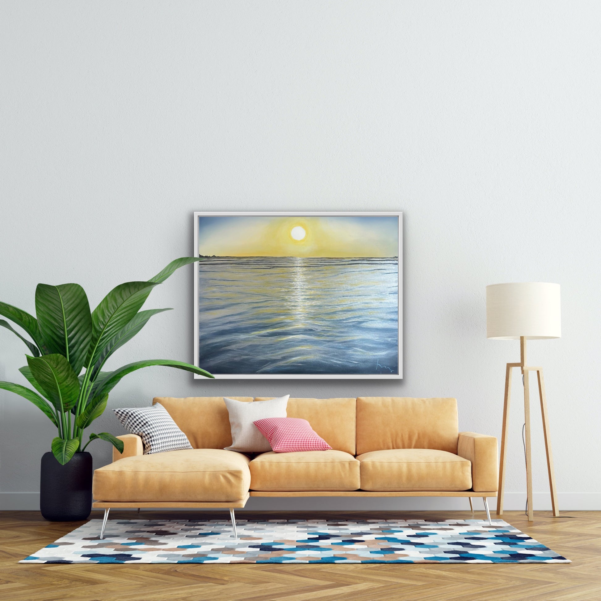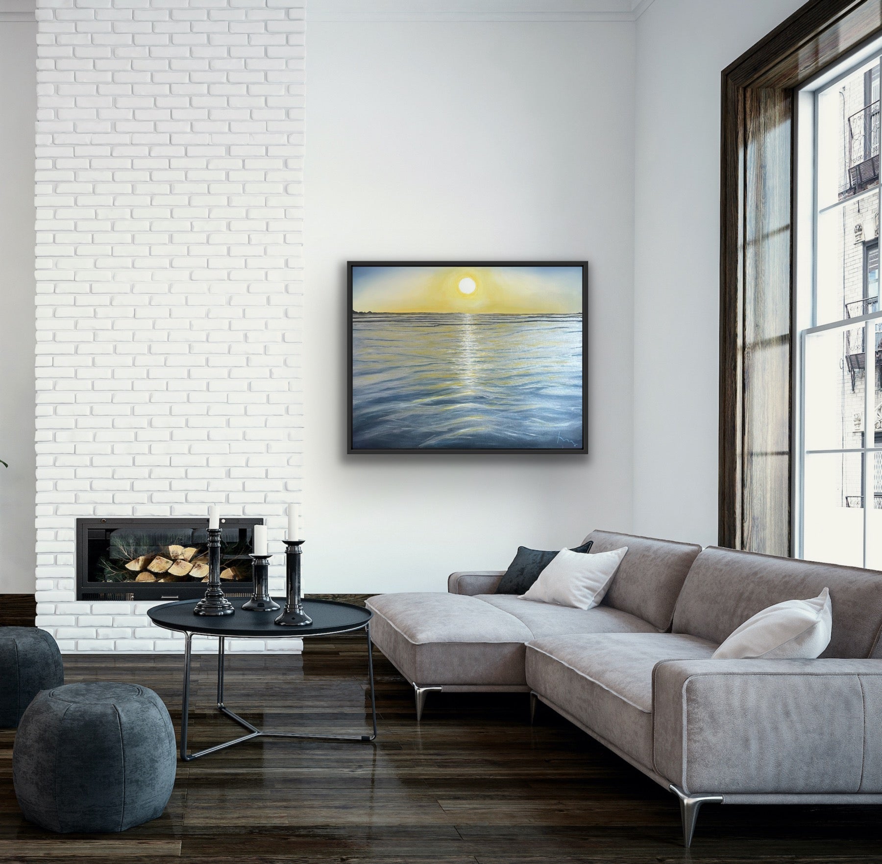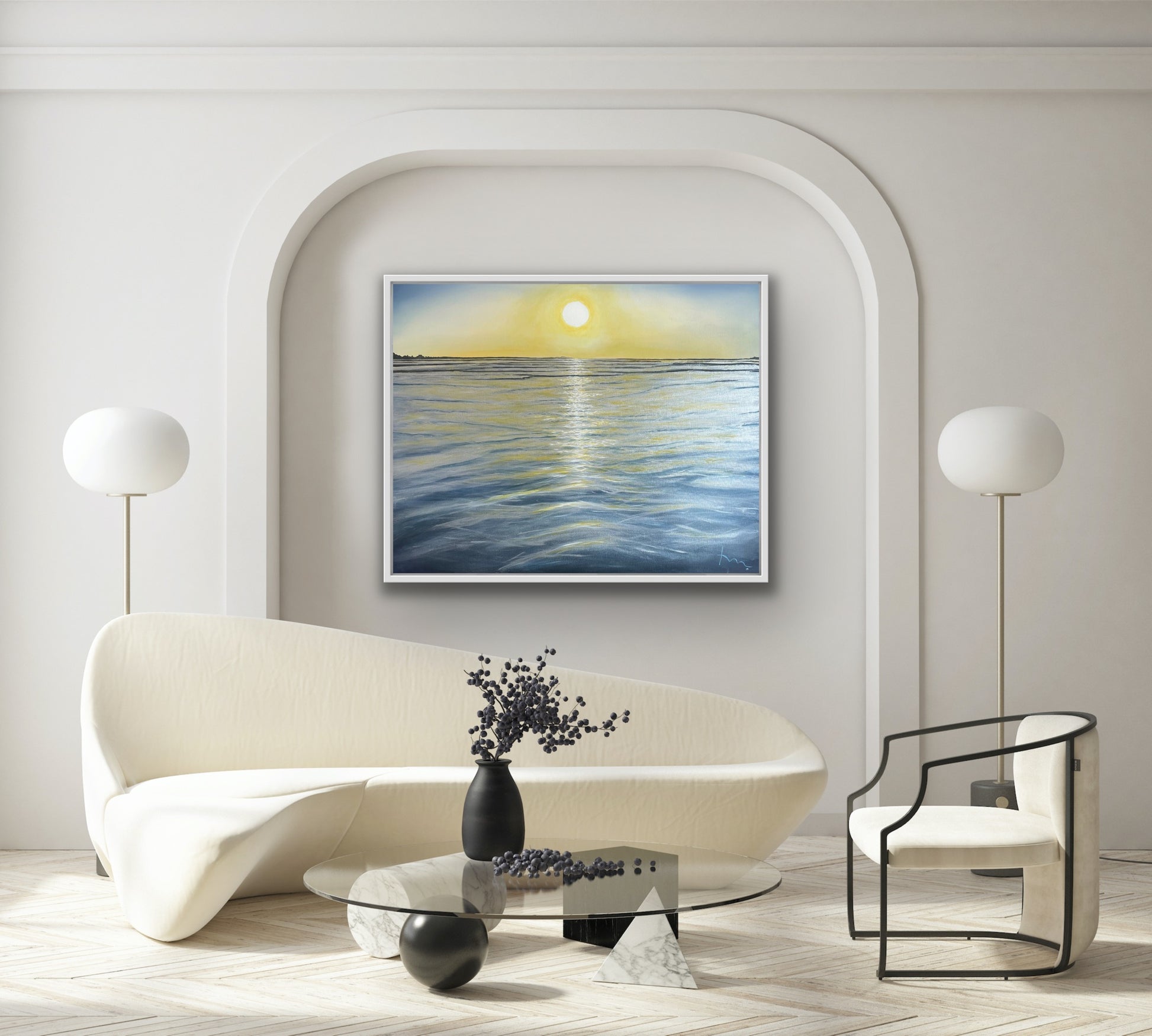 Das Werk „Sonnenaufgang über dem Meer“ von Monika Toplev lädt den Betrachter ein, den zauberhaften Moment des Tagesbeginns über einer ruhigen Wasserfläche zu erleben. In diesem Gemälde kombiniert die Künstlerin ihre typische Feinheit in der Darstellung von Licht und Wasser mit einer harmonischen Farbpalette. Das leuchtende Gelb der aufgehenden Sonne verschmilzt sanft mit den Blau- und Türkistönen des Meeres, wodurch eine beeindruckende Tiefe und Lebendigkeit entsteht.