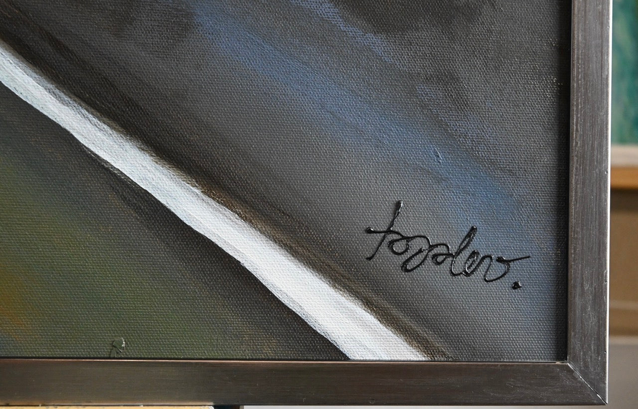 In der Ferne leuchten rötliche Lichter, die vermutlich Rücklichter von Fahrzeugen darstellen und einen Hauch von Bewegung und Urbanität in die Szenerie bringen. Die Malweise ist weich und atmosphärisch, mit betont verschwommenen Details, die den Eindruck von Geschwindigkeit oder einer Erinnerung hervorrufen. Das Gemälde vermittelt ein Gefühl von Ruhe und Weite, gepaart mit der Dynamik einer Straße.