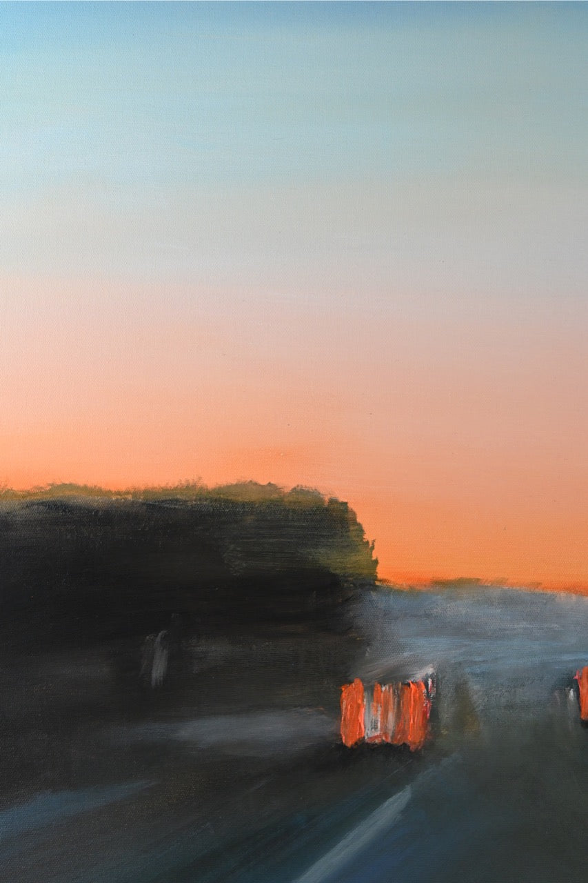 Im oberen Bereich des Gemäldes dominiert ein leuchtend orangefarbener Horizont, der sanft in ein klares Blau des Himmels übergeht. Der Sonnenuntergang taucht die Szenerie in ein warmes, gedämpftes Licht. Die Autobahn verläuft mittig durch das Bild und führt den Blick des Betrachters in die Tiefe. Auf der linken Seite ist eine dunkle Baumreihe angedeutet, während auf der rechten Seite Strukturen einer Böschung oder einer Wand angedeutet sind.