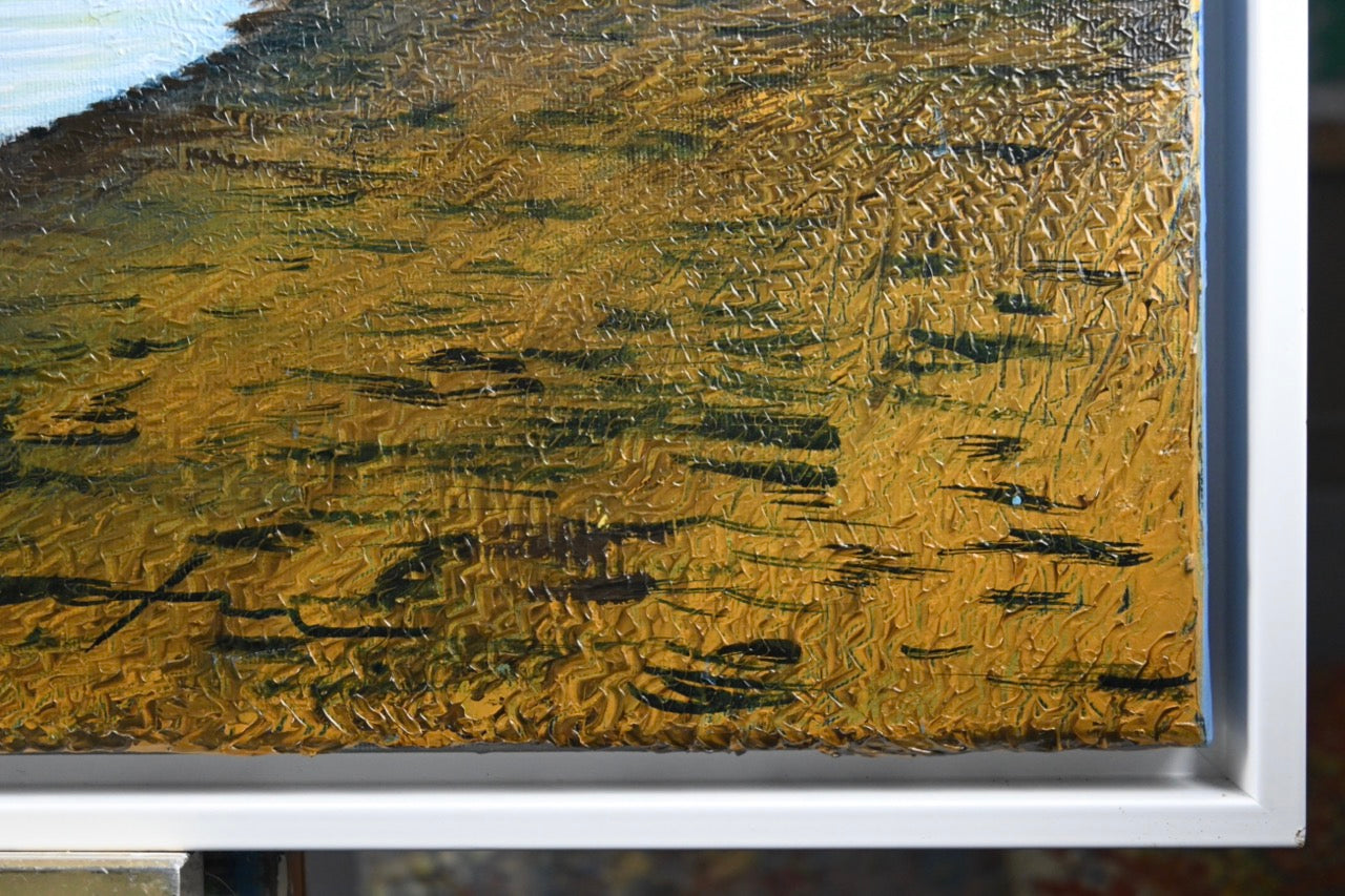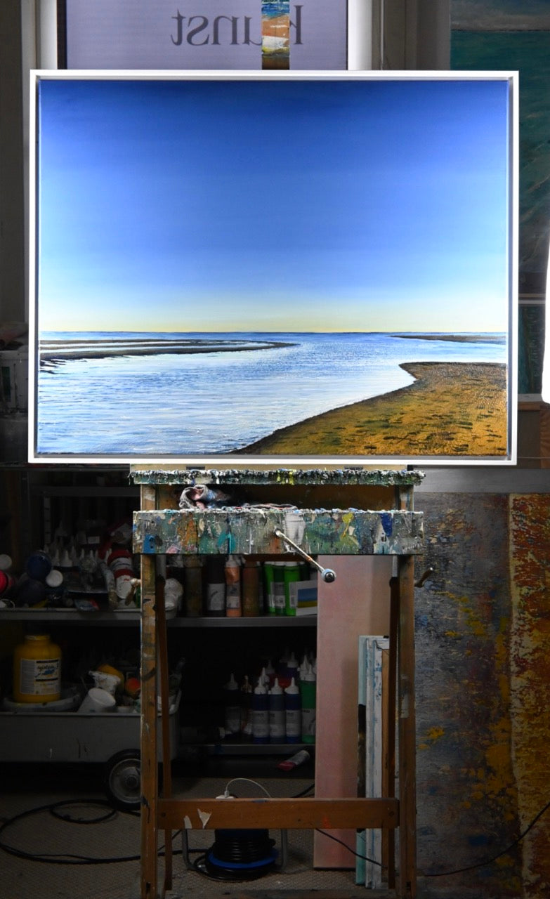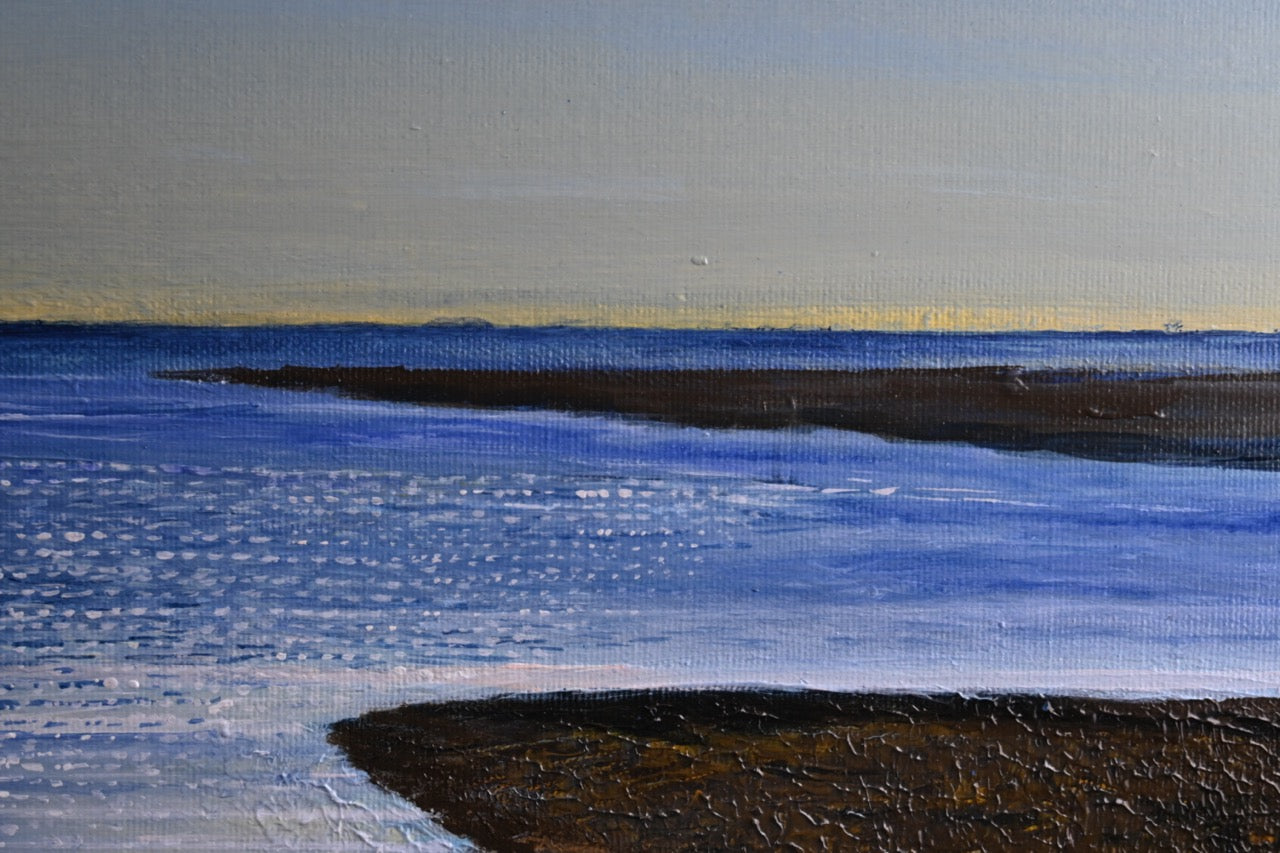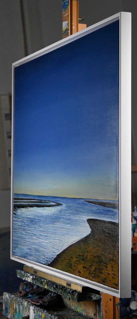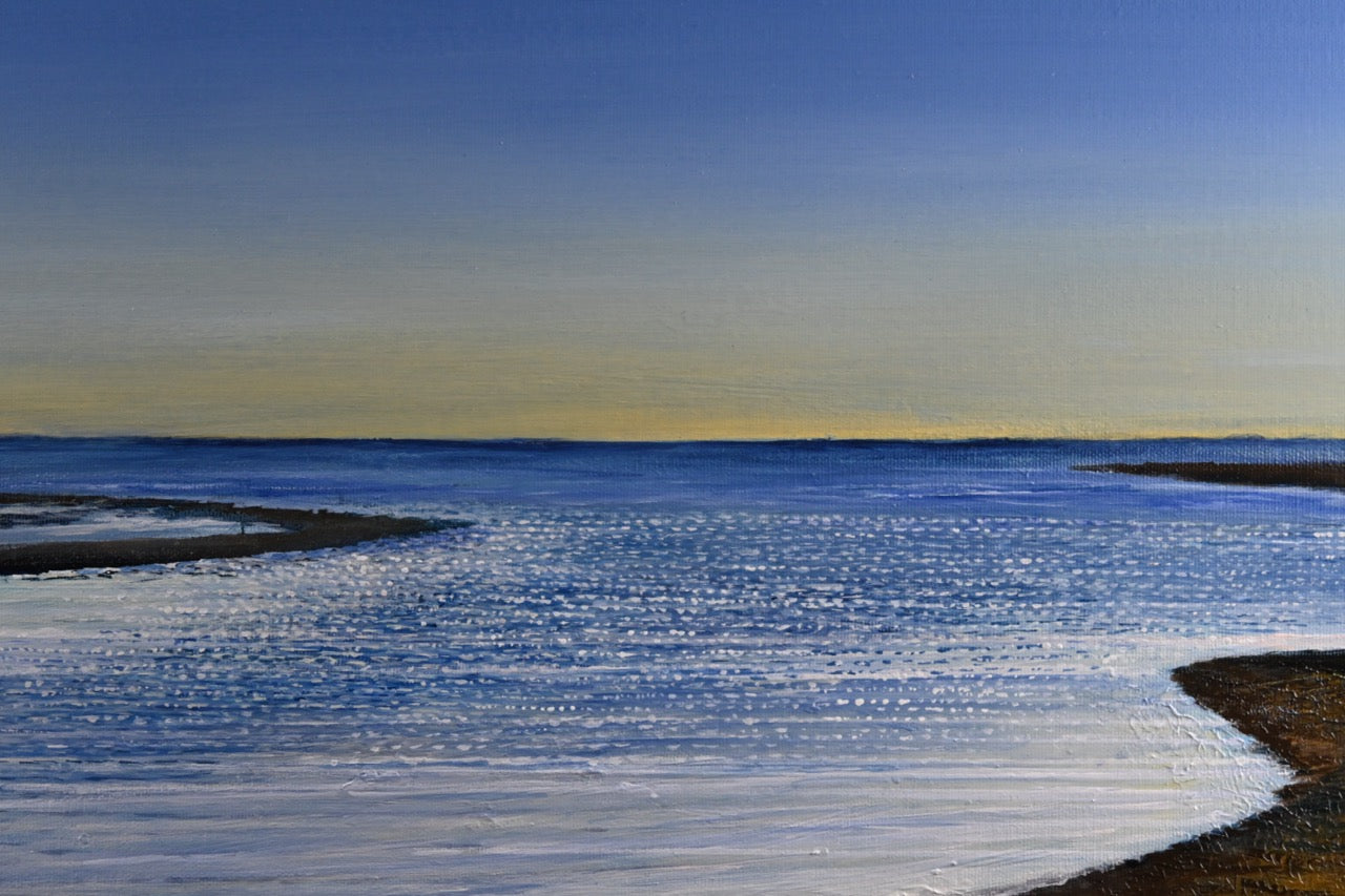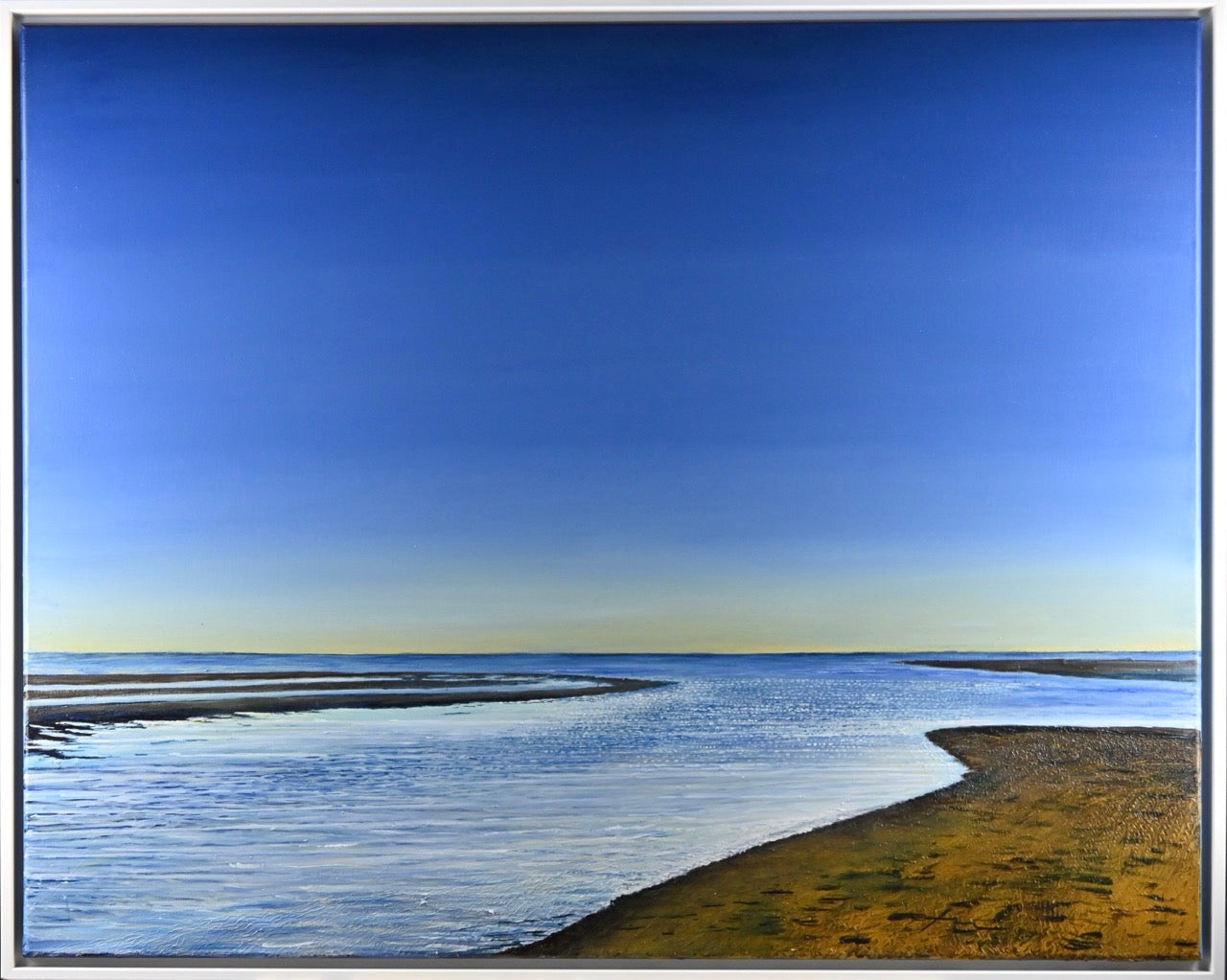 Toplev gelingt es in diesem Bild, eine beeindruckende Ruhe und Weite zu vermitteln, die typisch für ihre Arbeiten ist. Ihre Malweise kombiniert Präzision in der Landschaftsdarstellung mit einer atmosphärischen Farbgebung, die den Betrachter in die Szenerie eintauchen lässt. Die klare Horizontlinie und der makellose Farbverlauf im Himmel unterstreichen die meditative Wirkung des Werkes. Es steht exemplarisch für ihre Fähigkeit, natürliche Schönheit mit minimalistischem Ausdruck einzufangen.