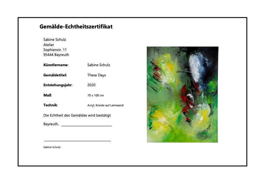 Das Gemälde „These Days“ beeindruckt durch seine ausdrucksstarke Farbgebung und die dynamische, gestische Malweise, mit der ein emotional aufgeladener Bildraum geschaffen wird. In einem intensiven Wechselspiel aus leuchtendem Grün, tiefem Schwarz, glühendem Rot und kühlem Weiß entfaltet sich eine abstrakte Komposition, die gleichermaßen energetisch wie rätselhaft wirkt.