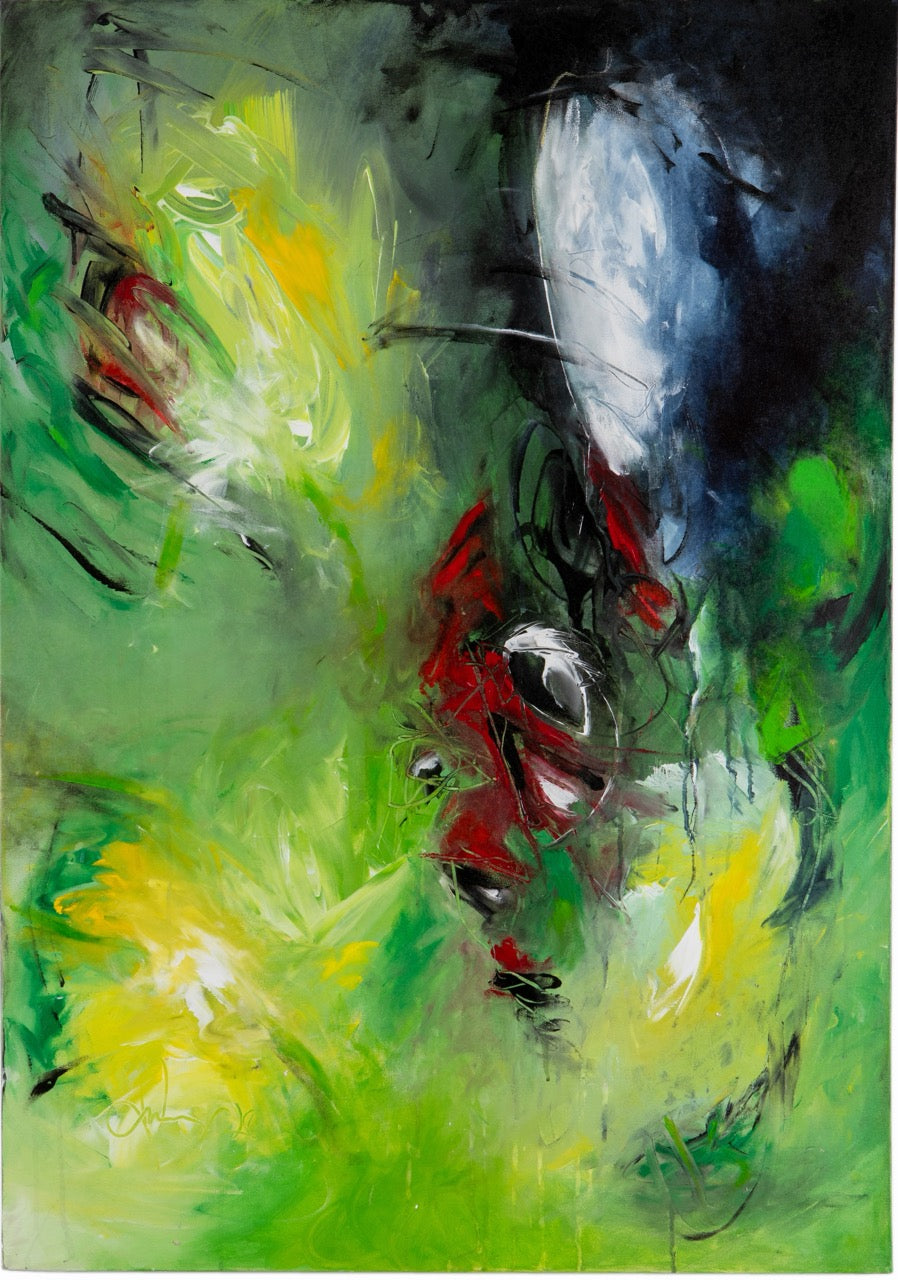Das Bild ist von einer dominierenden grünen Farbfläche durchzogen, die an Natur, Vitalität und Wandel erinnert. Innerhalb dieses grünen Feldes entwickeln sich Bewegungen: kräftige, fast eruptive Rot- und Schwarzakzente verdichten sich zur rechten Bildhälfte hin zu einem expressiven Zentrum, das eine spannungsgeladene Dynamik erzeugt. Diese Verdichtung wirkt wie ein implodierender Kern – roh, emotional, von starken Kontrasten durchzogen. Darüber erhebt sich eine ovale, fast schwebende Form in Weiß und Blau, die wie ein abstrahierter Lichtkörper oder eine fragile Projektionsfläche wirkt. Sie steht in starkem Kontrast zur Lebendigkeit der übrigen Farbflächen und verleiht dem Werk eine beinahe metaphysische Tiefe.