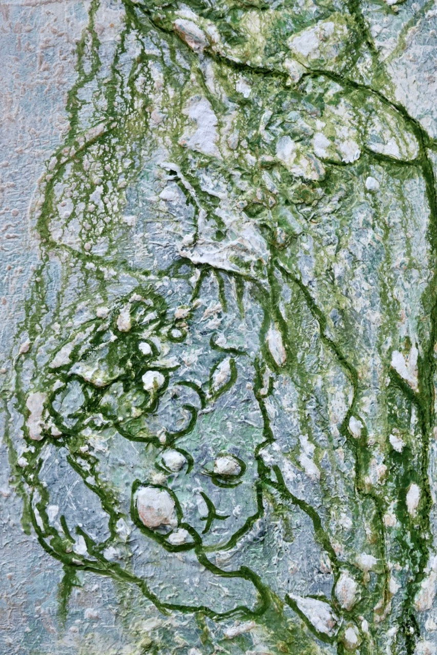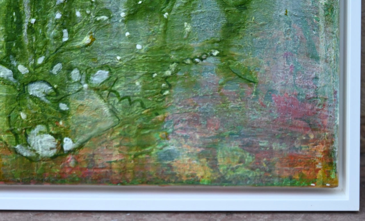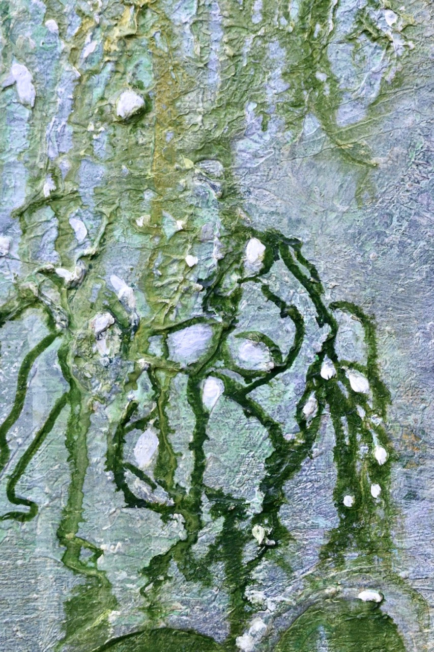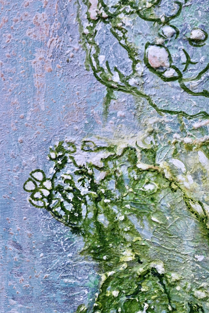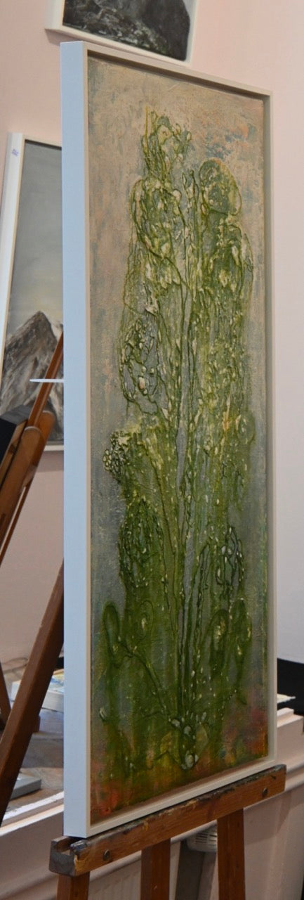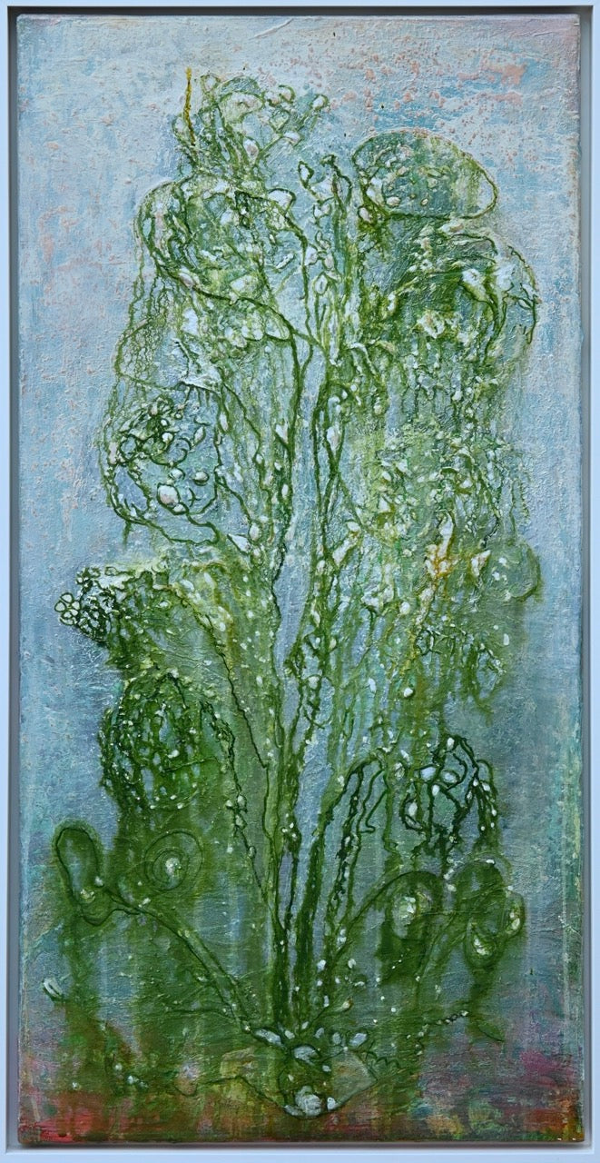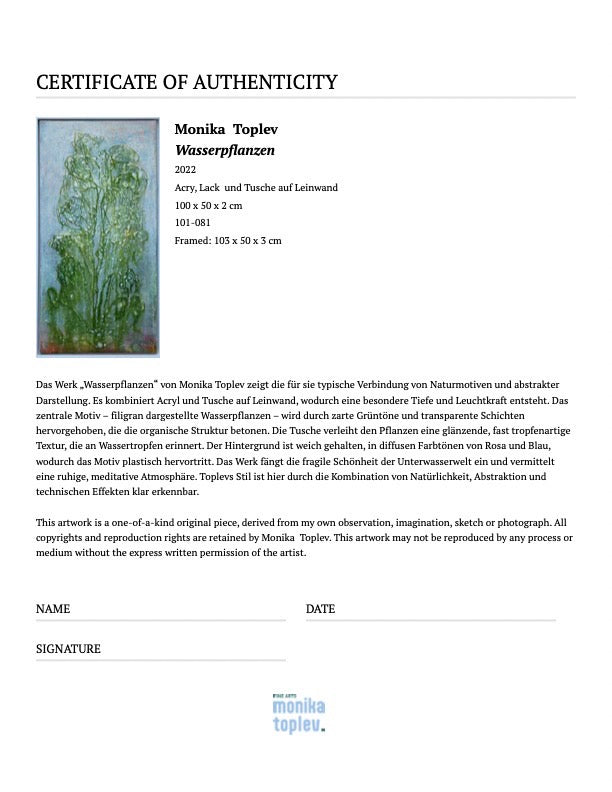 Das Werk „Wasserpflanzen“ von Monika Toplev zeigt die für sie typische Verbindung von Naturmotiven und abstrakter Darstellung. Es kombiniert Acryl und Lack und Tusche auf Leinwand, wodurch eine besondere Tiefe und Leuchtkraft entsteht. Das zentrale Motiv – filigran dargestellte Wasserpflanzen – wird durch zarte Grüntöne und transparente Schichten hervorgehoben, die die organische Struktur betonen. Die Lackelemente verleihen den Pflanzen eine glänzende, fast tropfenartige Textur, die an Wassertropfen erinnert. Der Hintergrund ist weich gehalten, in diffusen Farbtönen von Rosa und Blau, wodurch das Motiv plastisch hervortritt. Das Werk fängt die fragile Schönheit der Unterwasserwelt ein und vermittelt eine ruhige, meditative Atmosphäre. Toplevs Stil ist hier durch die Kombination von Natürlichkeit, Abstraktion und technischen Effekten klar erkennbar.
