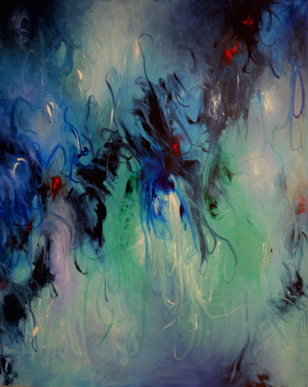 Wie ein Tanz unsichtbarer Kräfte entfaltet sich in diesem Werk ein Strömen von Farben und Formen. Tiefes Blau und sattes Grün verschmelzen zu einer fließenden Landschaft des Unbewussten,während helle Wirbel aus Weiß die Bewegung wie Windfäden durchziehen. Aus der Tiefe brechen Funken in leuchtendem Rot hervor – als wären es pulsierende Herzschläge, die das Bild zum Leben erwecken.