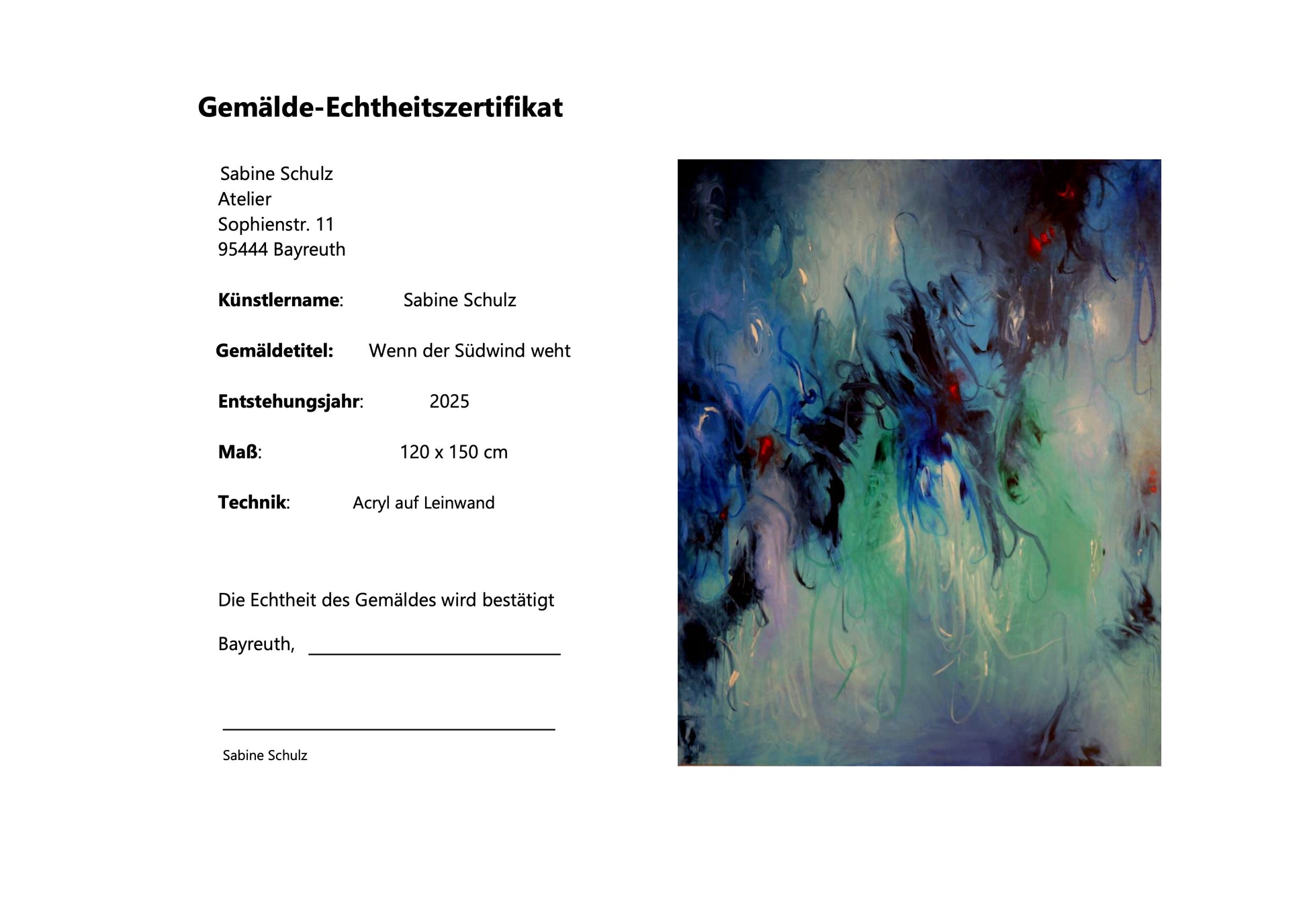 Das Gemälde wirkt wie ein Atemzug der Natur, ein Hauch von Sturm und Freiheit, getragen vom geheimnisvollen Rhythmus des Südwinds. Es lässt den Betrachter eintauchen in eine Sphäre zwischen Traum und Realität, in der die Elemente ihre eigene Sprache sprechen und die Leinwand zu einem vibrierenden Resonanzraum für Emotionen wird.