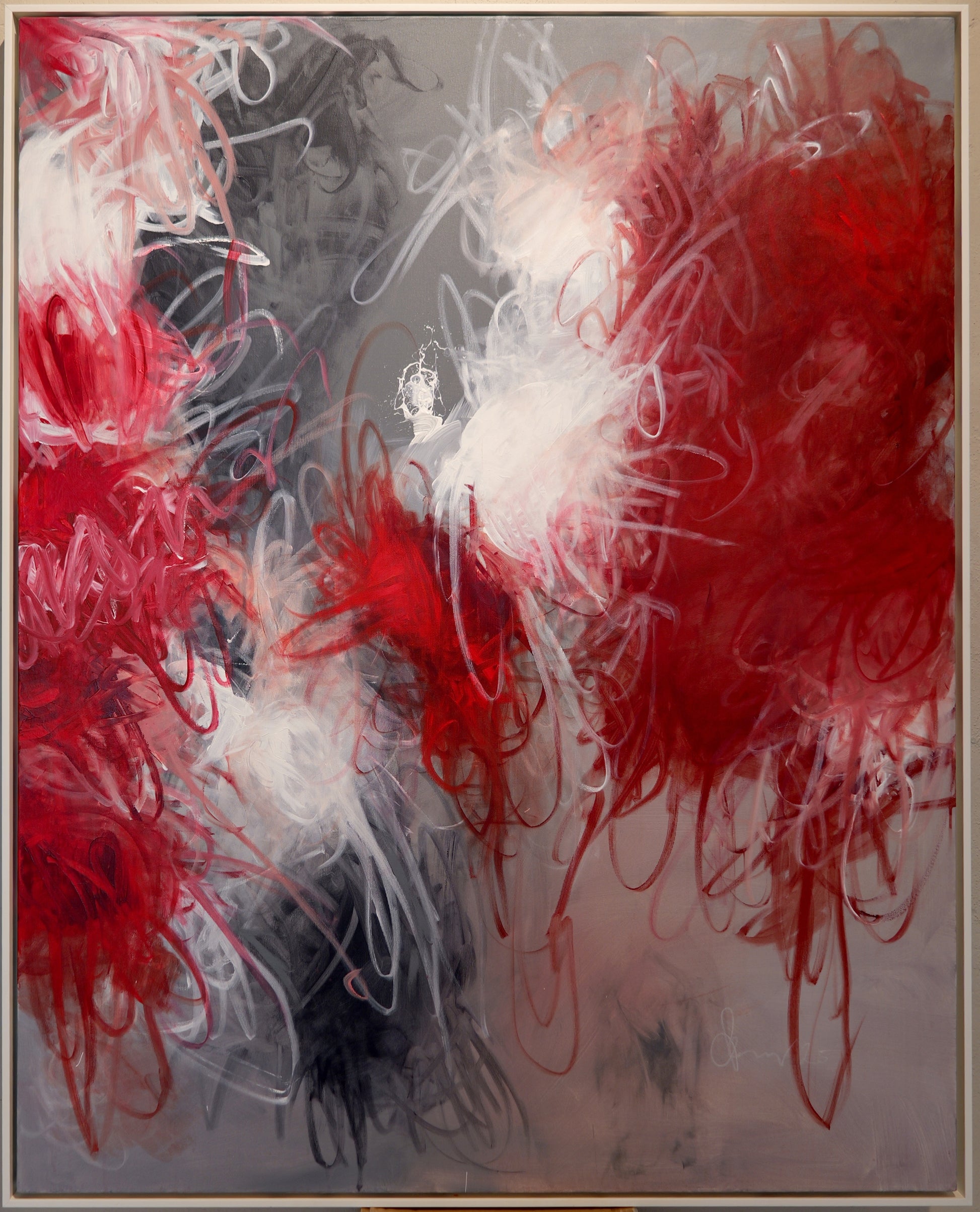 Das Rot pulsiert wie Herzschläge, feurig und ungezähmt, während das Weiß wie Licht durch die Komposition strömt, aufhellt, öffnet, Raum gibt. Tiefes Schwarz steigt aus dem Hintergrund empor, schenkt den Farben Tiefe und Gewicht. Gemeinsam erschaffen sie eine Choreografie aus Energie und Stille, aus Chaos und Harmonie.