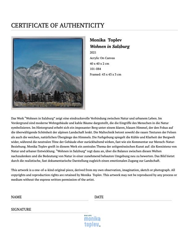 Monika Toplev greift in diesem Werk ein zentrales Thema der zeitgenössischen Kunst auf: die Koexistenz von Natur und urbaner Entwicklung. “Wohnen in Salzburg” regt dazu an, über die Balance zwischen diesen Welten nachzudenken und die Bedeutung von Natur in einer zunehmend bebauten Umgebung neu zu bewerten. Das Bild bietet durch die realistische, fast dokumentarische Darstellung zugleich einen emotionalen Zugang zur Landschaft.