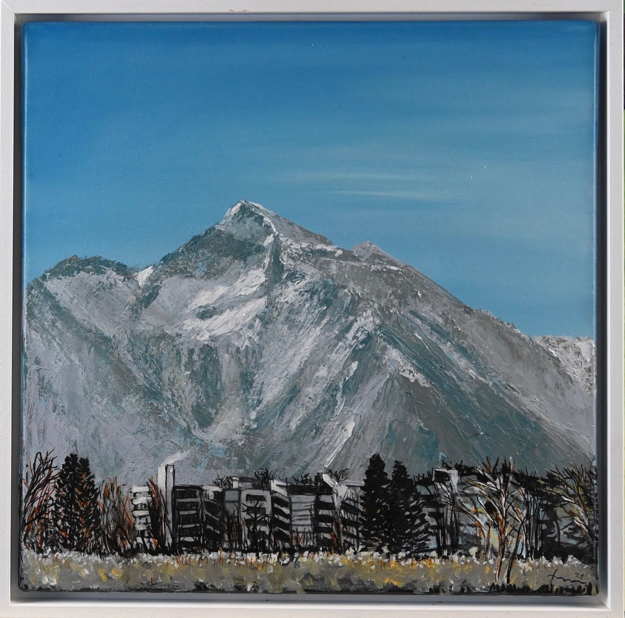Das Werk “Wohnen in Salzburg” von Monika Toplev zeigt eine eindrucksvolle Verbindung zwischen Natur und urbanem Leben. Im Vordergrund sind moderne Wohngebäude und kahle Bäume dargestellt, die die Eingriffe des Menschen in die Natur symbolisieren. Im Hintergrund erhebt sich ein imposanter Berg unter einem klaren, blauen Himmel, der den Fokus auf die überwältigende Schönheit der alpinen Landschaft lenkt.