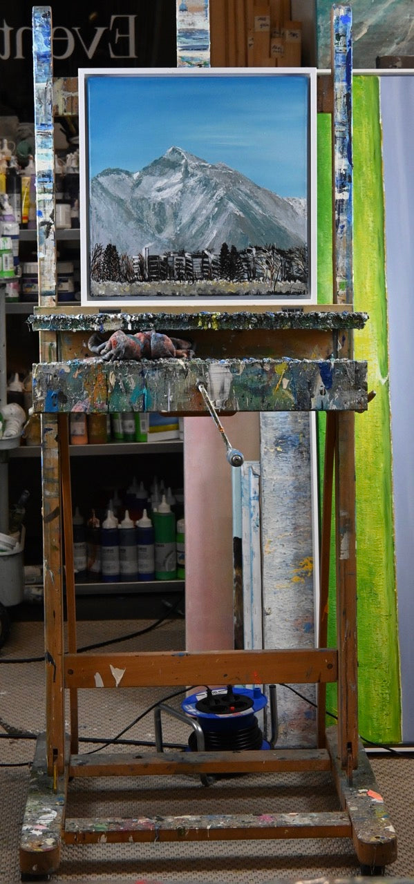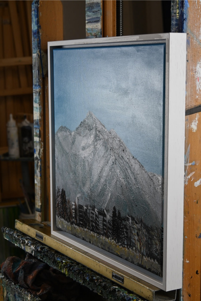 Die Maltechnik betont sowohl die rauen Texturen der Felsen als auch die weichen, natürlichen Übergänge des Himmels. Die Farbgebung spiegelt die Kühle und Klarheit der Bergwelt wider, während die neutralen Töne der Gebäude eher zurückhaltend wirken, fast wie ein Kommentar zur Mensch-Natur-Beziehung.