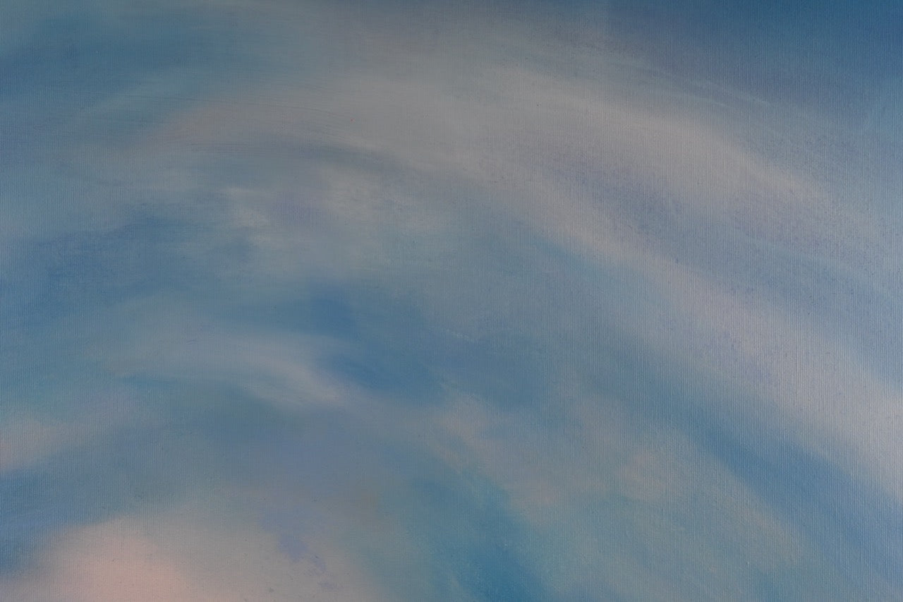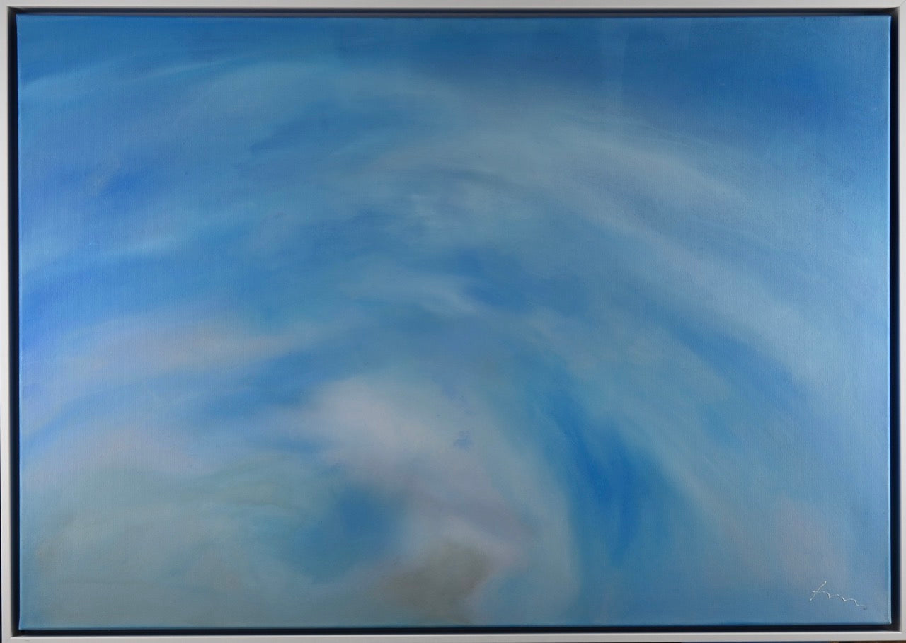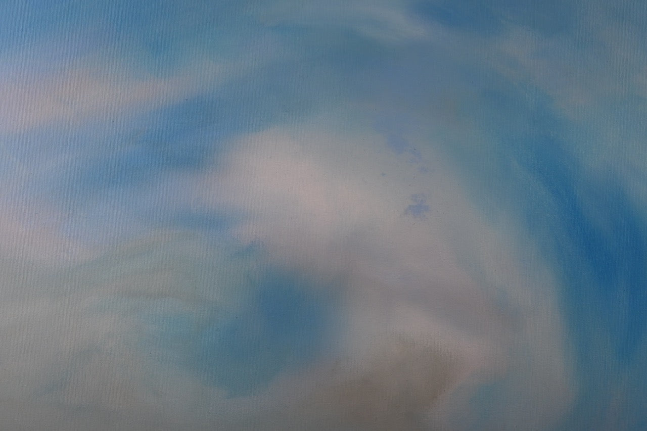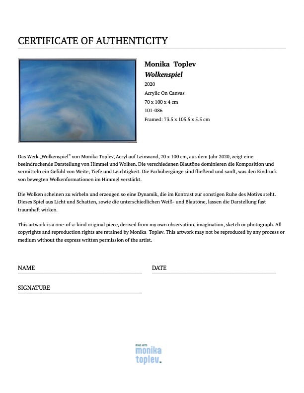 Das Werk „Wolkenspiel“ von Monika Toplev, Acryl auf Leinwand, 70 x 100 cm, aus dem Jahr 2020, zeigt eine beeindruckende Darstellung von Himmel und Wolken. Die verschiedenen Blautöne dominieren die Komposition und vermitteln ein Gefühl von Weite, Tiefe und Leichtigkeit. Die Farbübergänge sind fließend und sanft, was den Eindruck von bewegten Wolkenformationen im Himmel verstärkt.