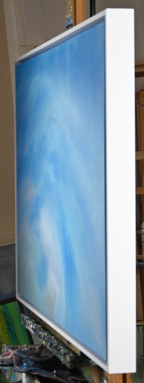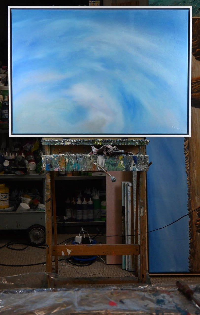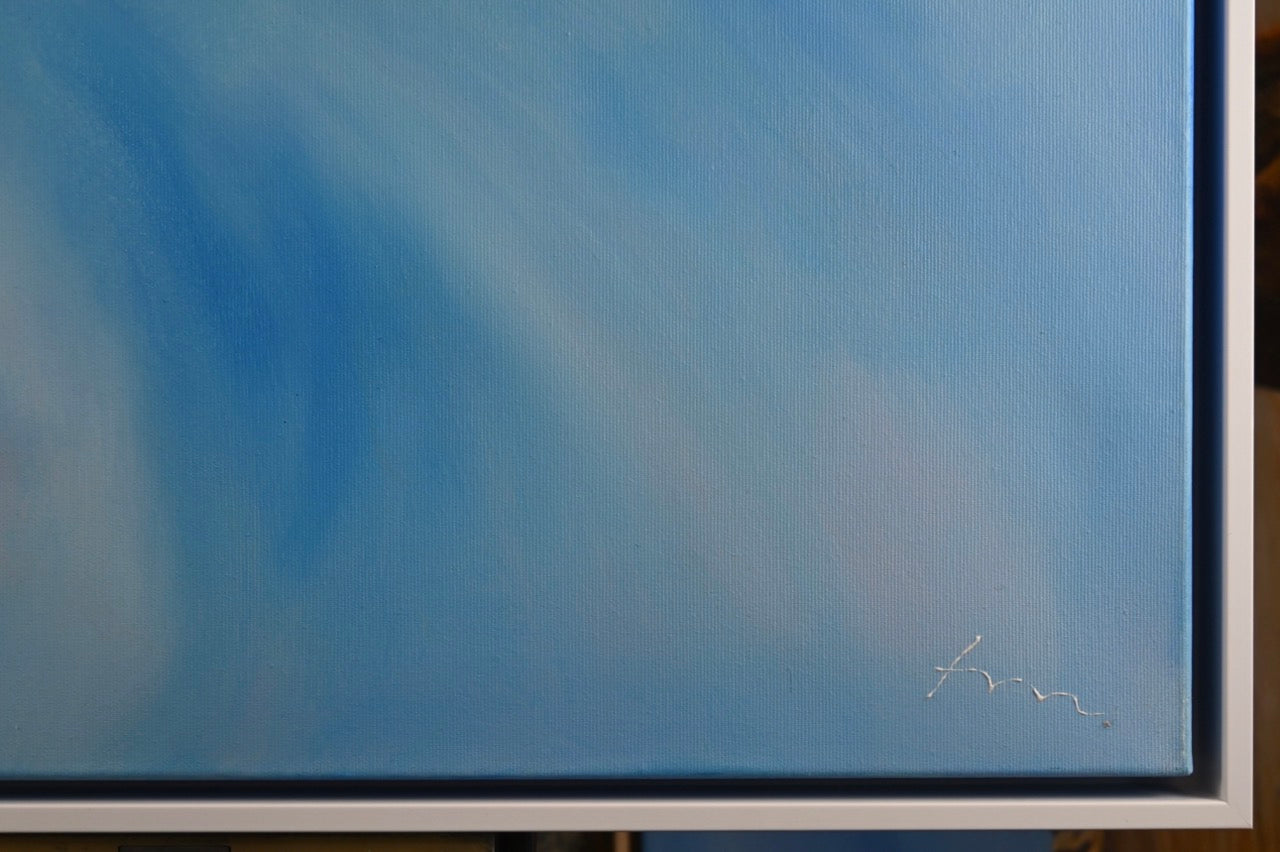Das Werk „Wolkenspiel“ von Monika Toplev, Acryl auf Leinwand, 70 x 100 cm, aus dem Jahr 2020, zeigt eine beeindruckende Darstellung von Himmel und Wolken. Die verschiedenen Blautöne dominieren die Komposition und vermitteln ein Gefühl von Weite, Tiefe und Leichtigkeit. Die Farbübergänge sind fließend und sanft, was den Eindruck von bewegten Wolkenformationen im Himmel verstärkt.