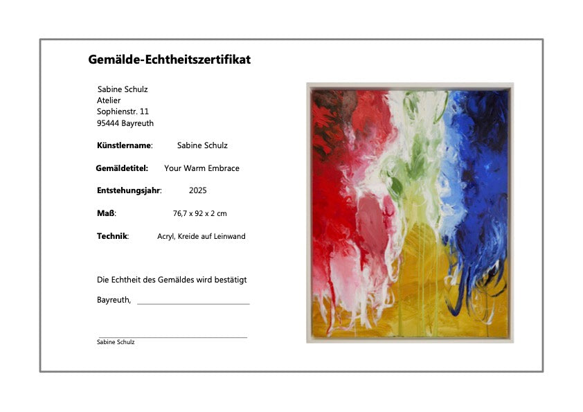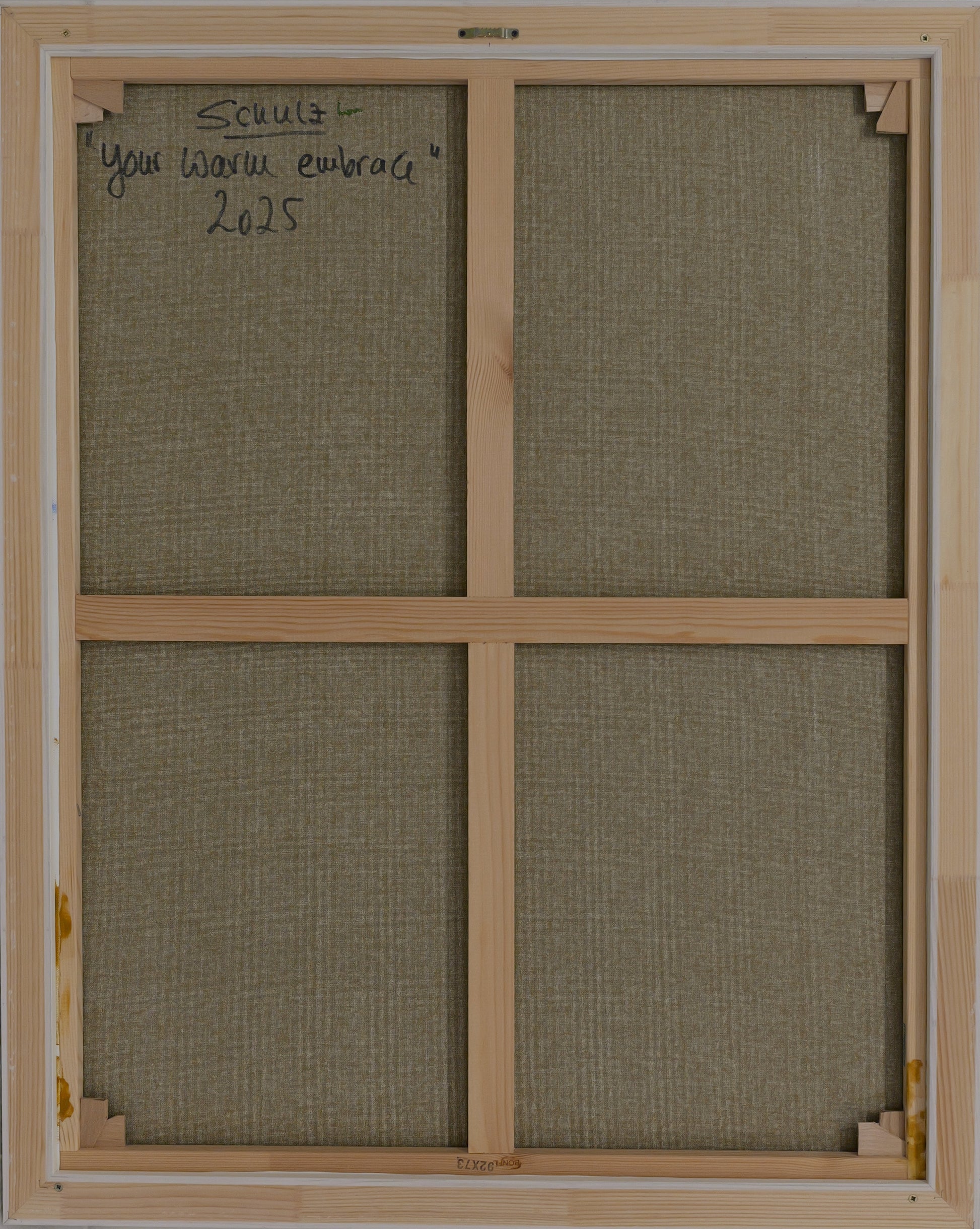 In „Your Warm Embrace“ entfaltet sich eine kraftvolle, farbdurchdrungene Komposition, die sowohl durch ihre emotionale Wucht als auch durch ihre zarte Balance zwischen Gegensätzen besticht.