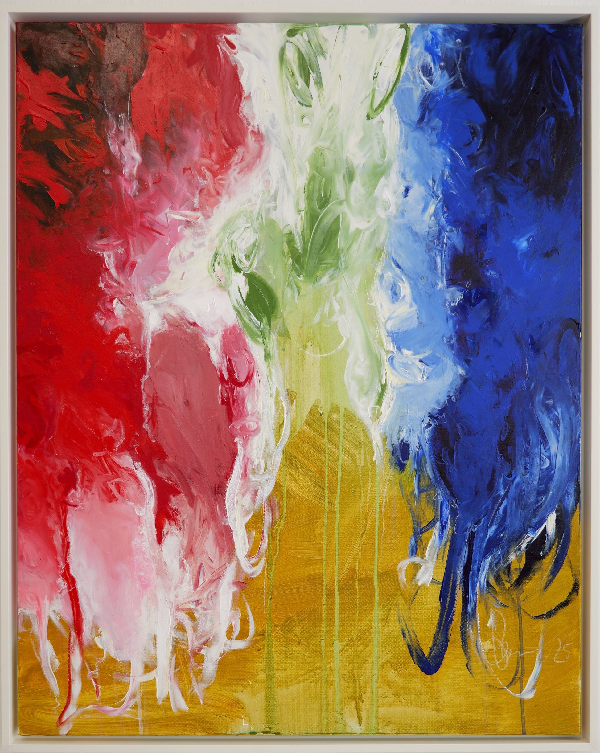 Die Malweise ist gestisch, fast körperlich. Mit sichtbaren Pinselzügen, Verwischungen und Farbläufen gelingt es der Künstlerin, Bewegung spürbar zu machen – nicht nur als formales Mittel, sondern als Ausdruck von Begegnung. Das Rot auf der linken Seite pulsiert vor Energie und Leidenschaft, während das tiefe Blau auf der rechten Seite eine stille Kraft und innere Weite ausstrahlt. Zwischen ihnen öffnet sich ein Licht – das Zentrum in Weiß- und Grüntönen –, das wie ein Moment der Versöhnung wirkt. Es ist nicht der Gegensatz, der betont wird, sondern das verbindende Dazwischen.