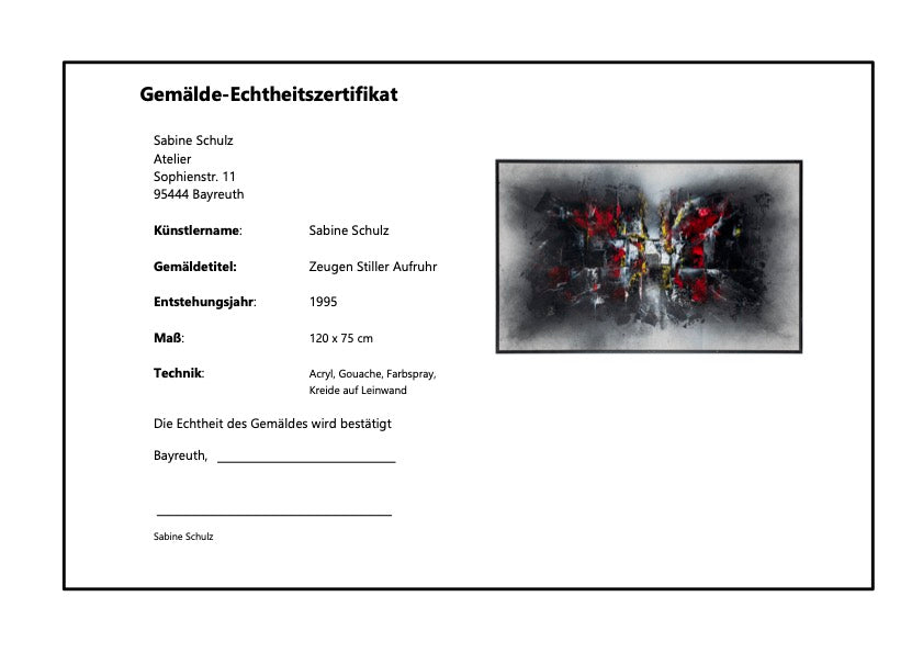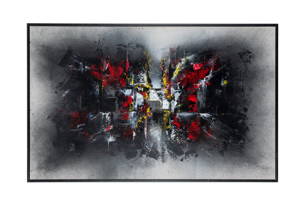 Das Bild ist ein abstraktes Gemälde, gerahmt in einem schwarzen Rahmen. Die Leinwand ist mit einer grauen, fast aschfarbenen Grundierung versehen, über der sich eine dynamische Komposition aus verschiedenen Farbschichten befindet. Die dominierenden Farben sind Schwarz und Grau, mit starken, brokatartigen Akzenten in leuchtendem Rot und Gelb. Die Farbflächen sind nicht klar abgegrenzt, sondern scheinen ineinander zu verlaufen und überlappen sich. Es gibt Bereiche, die stark strukturiert sind, fast wie eine Collage aus kleinen, eckigen Formen und Flächen. Andere Bereiche wirken eher pastos und flächig aufgetragen. In der Mitte des Bildes ist ein Bereich etwas heller, der eine gewisse Struktur aufweist, die an Gebäude oder architektonische Elemente erinnert. Die roten und gelben Farbakzente sind eher in Form von Flecken oder Spritzern aufgetragen und setzen sich kontrastreich gegen den dunklen Hintergrund ab. Die gesamte Komposition wirkt kraftvoll und dynamisch, fast explosiv. Die Stimmung ist ambivalent: Die dunklen Farben vermitteln eine gewisse Schwere, Melancholie oder gar Bedrohlichkeit, während die leuchtenden Farben Hoffnung, Energie oder vielleicht auch Gefahr suggerieren. Das Bild wirkt insgesamt sehr expressiv und emotional.